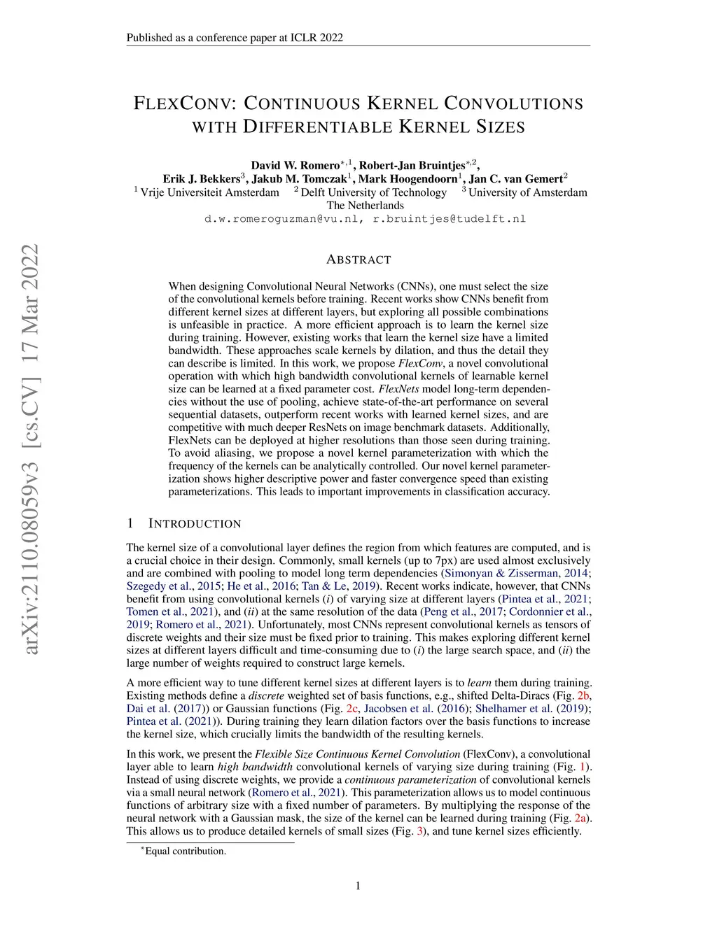 FlexConv: Continuous Kernel Convolutions with Differentiable Kernel