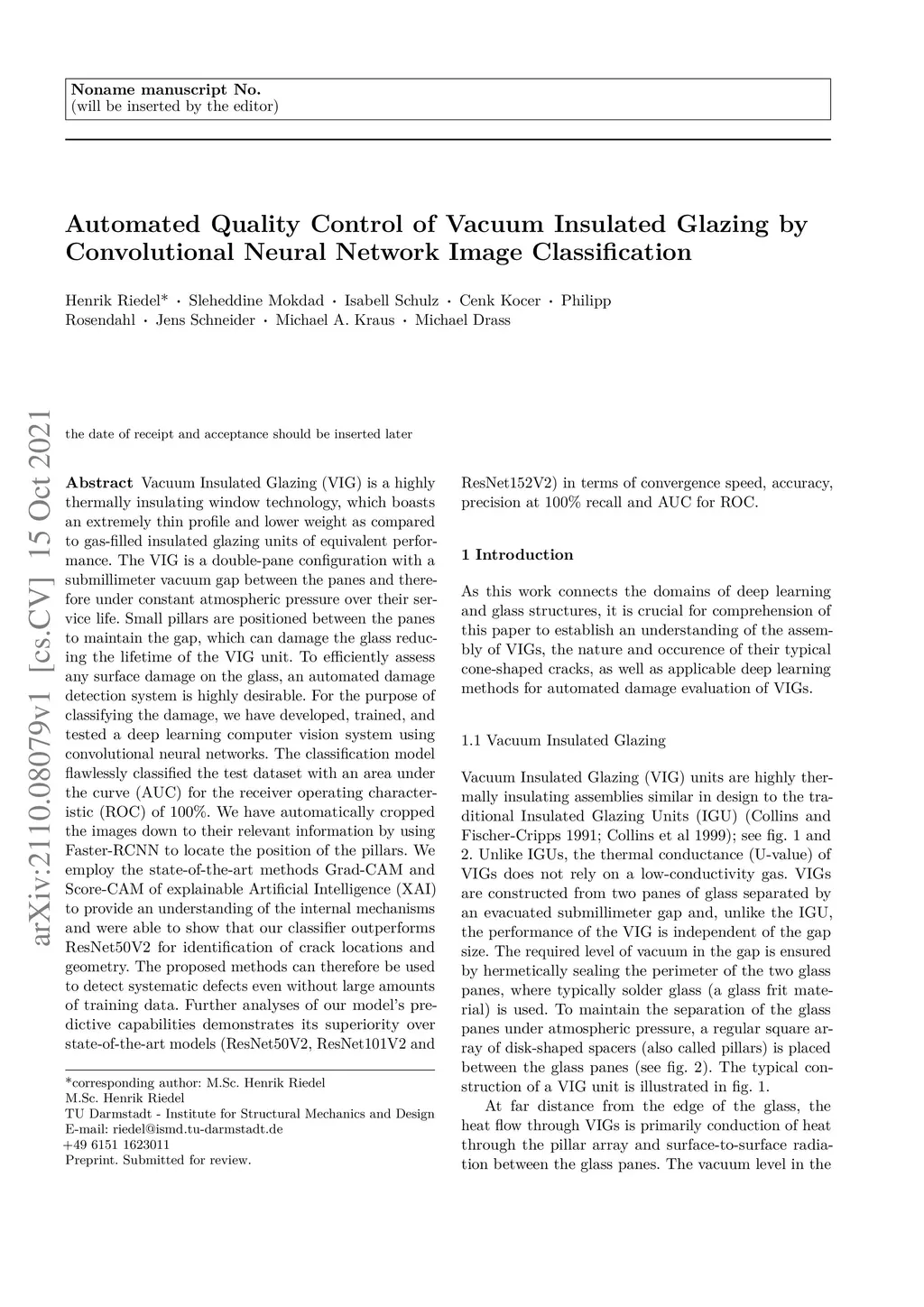 Vacuum Insulated Glazing (VIG) is a highly thermally insulating window technology, which boasts an extremely thin profile and lower weight as compared to gas-filled insulated glazing units of equivalent performance. The VIG is a double-pane configuration with a submillimeter vacuum gap between the panes and therefore under constant atmospheric pressure over their service life. Small pillars are positioned between the panes to maintain the gap, which can damage the glass reducing the lifetime of the VIG unit. To efficiently assess any surface damage on the glass, an automated damage detection system is highly desirable. For the purpose of classifying the damage, we have developed, trained, and tested a deep learning computer vision system using convolutional neural networks. The classification model flawlessly classified the test dataset with an area under the curve (AUC) for the receiver operating characteristic (ROC) of 100%. We have automatically cropped the images down to their relevant information by using Faster-RCNN to locate the position of the pillars. We employ the state-of-the-art methods Grad-CAM and Score-CAM of explainable Artificial Intelligence (XAI) to provide an understanding of the internal mechanisms and were able to show that our classifier outperforms ResNet50V2 for identification of crack locations and geometry. The proposed methods can therefore be used to detect systematic defects even without large amounts of training data. Further analyses of our model's predictive capabilities demonstrates its superiority over state-of-the-art models (ResNet50V2, ResNet101V2 and ResNet152V2) in terms of convergence speed, accuracy, precision at 100% recall and AUC for ROC.
