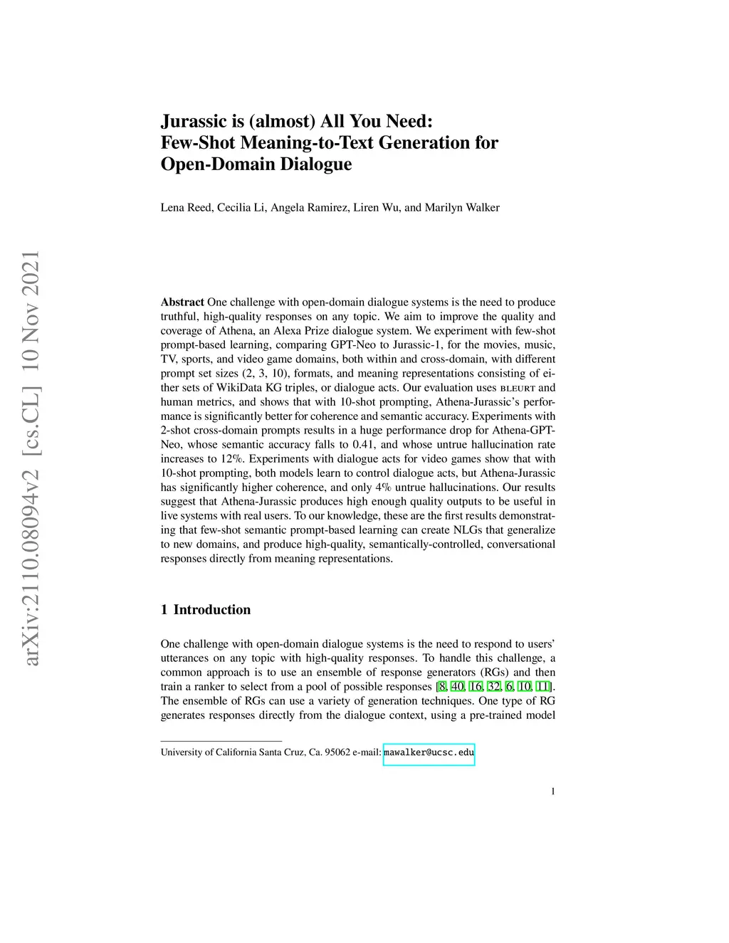One challenge with open-domain dialogue systems is the need to produce truthful, high-quality responses on any topic. We aim to improve the quality and coverage of Athena, an Alexa Prize dialogue system. We experiment with few-shot prompt-based learning, comparing GPT-Neo to Jurassic-1, for the movies, music, TV, sports, and video game domains, both within and cross-domain, with different prompt set sizes (2, 3, 10), formats, and meaning representations consisting of either sets of WikiData KG triples, or dialogue acts. Our evaluation uses BLEURT and human metrics, and shows that with 10-shot prompting, Athena-Jurassic's performance is significantly better for coherence and semantic accuracy. Experiments with 2-shot cross-domain prompts results in a huge performance drop for Athena-GPT-Neo, whose semantic accuracy falls to 0.41, and whose untrue hallucination rate increases to 12%. Experiments with dialogue acts for video games show that with 10-shot prompting, both models learn to control dialogue acts, but Athena-Jurassic has significantly higher coherence, and only 4% untrue hallucinations. Our results suggest that Athena-Jurassic produces high enough quality outputs to be useful in live systems with real users. To our knowledge, these are the first results demonstrating that few-shot semantic prompt-based learning can create NLGs that generalize to new domains, and produce high-quality, semantically-controlled, conversational responses directly from meaning representations.