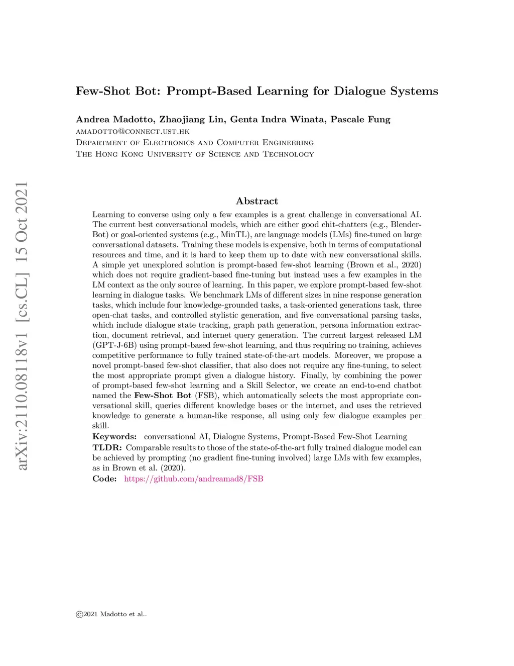 Few-Shot Bot: Prompt-Based Learning for Dialogue Systems