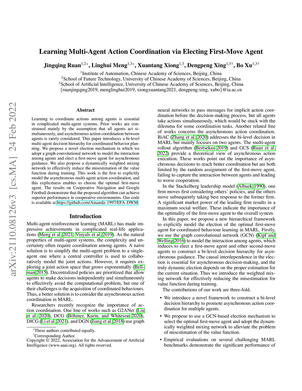Learning to coordinate actions among agents is essential in complicated multi-agent systems. Prior works are constrained mainly by the assumption that all agents act simultaneously, and asynchronous action coordination between agents is rarely considered. This paper introduces a bi-level multi-agent decision hierarchy for coordinated behavior planning. We propose a novel election mechanism in which we adopt a graph convolutional network to model the interaction among agents and elect a first-move agent for asynchronous guidance. We also propose a dynamically weighted mixing network to effectively reduce the misestimation of the value function during training. This work is the first to explicitly model the asynchronous multi-agent action coordination, and this explicitness enables to choose the optimal first-move agent. The results on Cooperative Navigation and Google Football demonstrate that the proposed algorithm can achieve superior performance in cooperative environments. Our code is available at \url{https://github.com/Amanda-1997/EFA-DWM}.