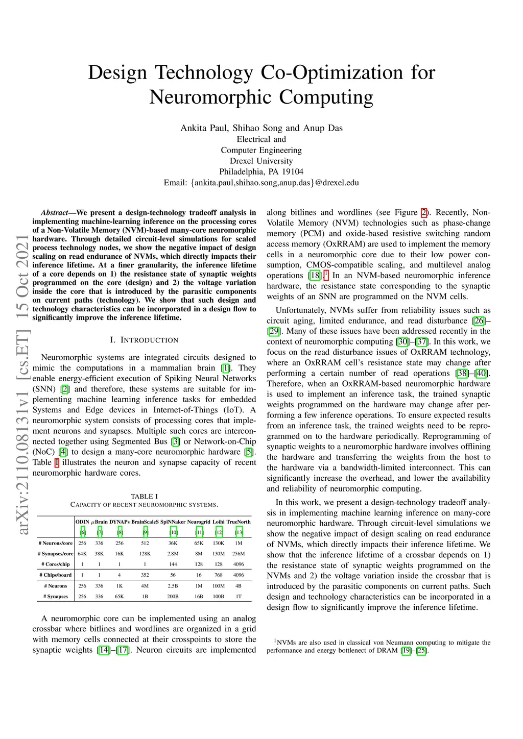 We present a design-technology tradeoff analysis in implementing machine-learning inference on the processing cores of a Non-Volatile Memory (NVM)-based many-core neuromorphic hardware. Through detailed circuit-level simulations for scaled process technology nodes, we show the negative impact of design scaling on read endurance of NVMs, which directly impacts their inference lifetime. At a finer granularity, the inference lifetime of a core depends on 1) the resistance state of synaptic weights programmed on the core (design) and 2) the voltage variation inside the core that is introduced by the parasitic components on current paths (technology). We show that such design and technology characteristics can be incorporated in a design flow to significantly improve the inference lifetime.