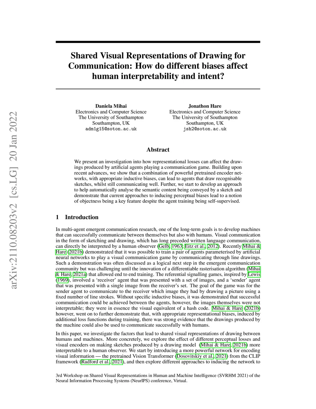 We present an investigation into how representational losses can affect the drawings produced by artificial agents playing a communication game. Building upon recent advances, we show that a combination of powerful pretrained encoder networks, with appropriate inductive biases, can lead to agents that draw recognisable sketches, whilst still communicating well. Further, we start to develop an approach to help automatically analyse the semantic content being conveyed by a sketch and demonstrate that current approaches to inducing perceptual biases lead to a notion of objectness being a key feature despite the agent training being self-supervised.