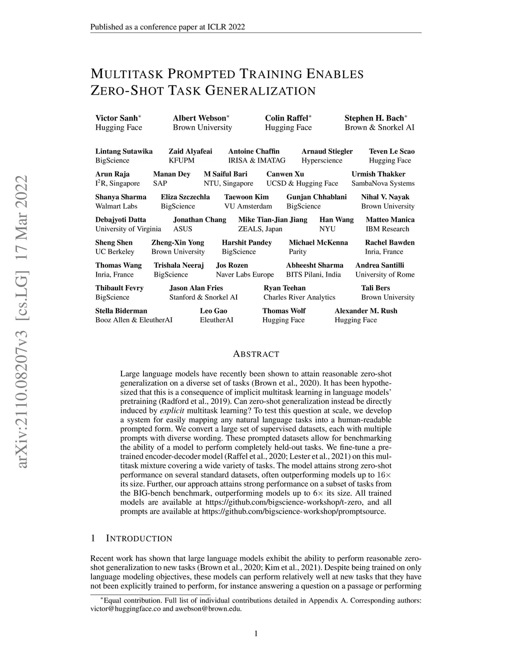 Large language models have recently been shown to attain reasonable zero-shot generalization on a diverse set of tasks (Brown et al., 2020). It has been hypothesized that this is a consequence of implicit multitask learning in language models' pretraining (Radford et al., 2019). Can zero-shot generalization instead be directly induced by explicit multitask learning? To test this question at scale, we develop a system for easily mapping any natural language tasks into a human-readable prompted form. We convert a large set of supervised datasets, each with multiple prompts with diverse wording. These prompted datasets allow for benchmarking the ability of a model to perform completely held-out tasks. We fine-tune a pretrained encoder-decoder model (Raffel et al., 2020; Lester et al., 2021) on this multitask mixture covering a wide variety of tasks. The model attains strong zero-shot performance on several standard datasets, often outperforming models up to 16x its size. Further, our approach attains strong performance on a subset of tasks from the BIG-bench benchmark, outperforming models up to 6x its size. All trained models are available at https://github.com/bigscience-workshop/t-zero and all prompts are available at https://github.com/bigscience-workshop/promptsource.