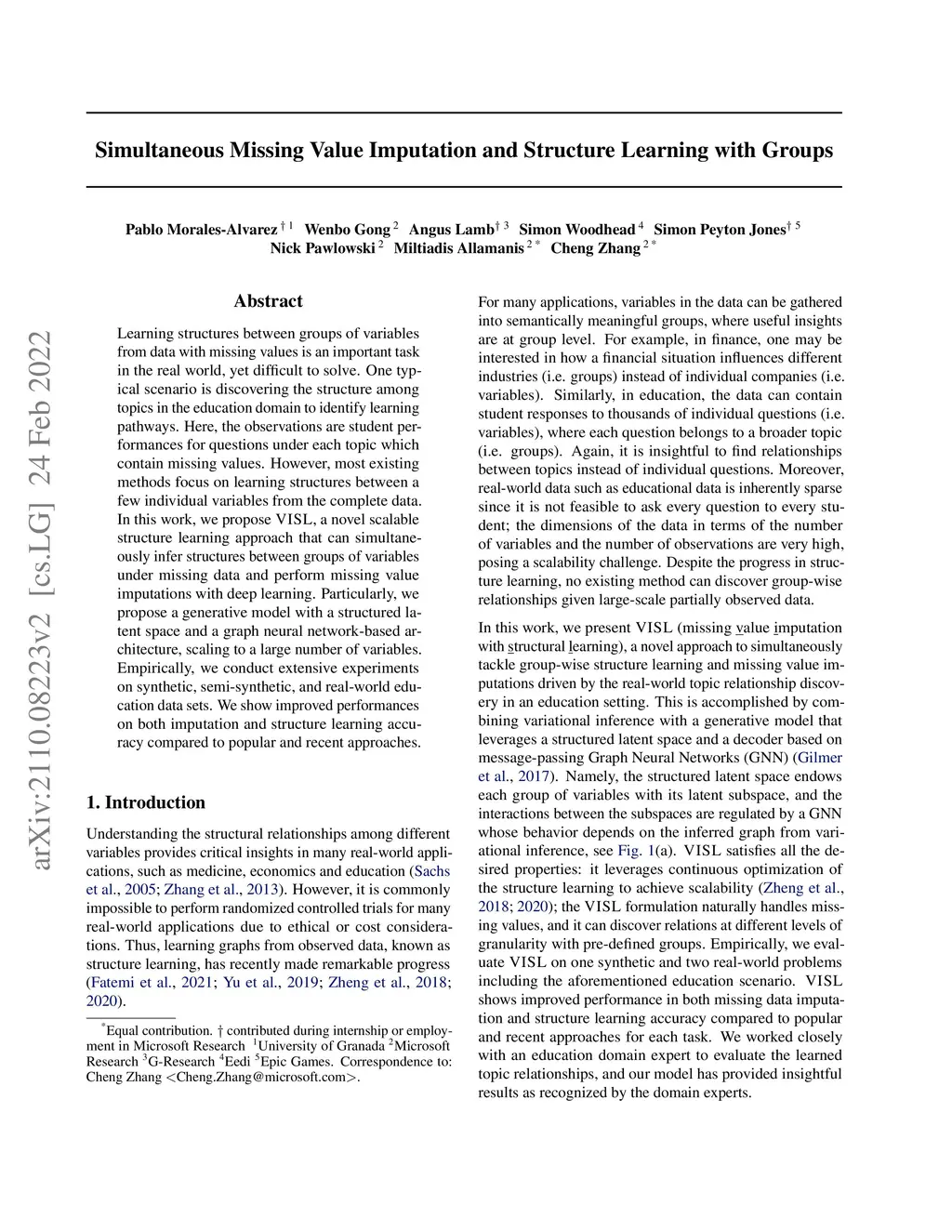 Learning structures between groups of variables from data with missing values is an important task in the real world, yet difficult to solve. One typical scenario is discovering the structure among topics in the education domain to identify learning pathways. Here, the observations are student performances for questions under each topic which contain missing values. However, most existing methods focus on learning structures between a few individual variables from the complete data. In this work, we propose VISL, a novel scalable structure learning approach that can simultaneously infer structures between groups of variables under missing data and perform missing value imputations with deep learning. Particularly, we propose a generative model with a structured latent space and a graph neural network-based architecture, scaling to a large number of variables. Empirically, we conduct extensive experiments on synthetic, semi-synthetic, and real-world education data sets. We show improved performances on both imputation and structure learning accuracy compared to popular and recent approaches.