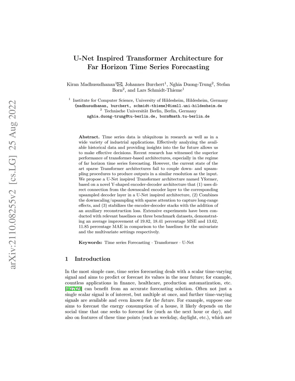 Time series data is ubiquitous in research as well as in a wide variety of industrial applications. Effectively analyzing the available historical data and providing insights into the far future allows us to make effective decisions. Recent research has witnessed the superior performance of transformer-based architectures, especially in the regime of far horizon time series forecasting. However, the current state of the art sparse Transformer architectures fail to couple down- and upsampling procedures to produce outputs in a similar resolution as the input. We propose the Yformer model, based on a novel Y-shaped encoder-decoder architecture that (1) uses direct connection from the downscaled encoder layer to the corresponding upsampled decoder layer in a U-Net inspired architecture, (2) Combines the downscaling/upsampling with sparse attention to capture long-range effects, and (3) stabilizes the encoder-decoder stacks with the addition of an auxiliary reconstruction loss. Extensive experiments have been conducted with relevant baselines on four benchmark datasets, demonstrating an average improvement of 19.82, 18.41 percentage MSE and 13.62, 11.85 percentage MAE in comparison to the current state of the art for the univariate and the multivariate settings respectively.