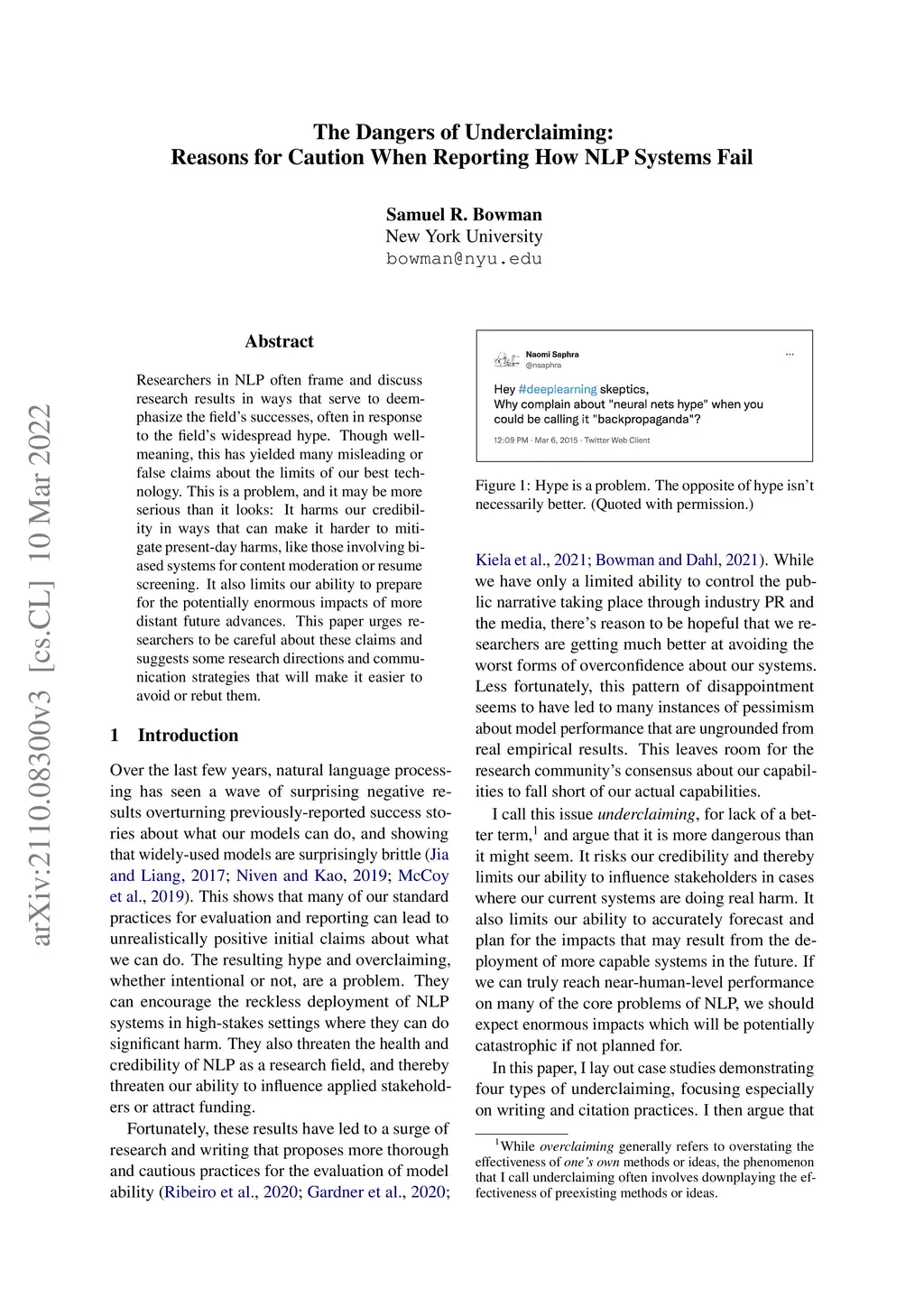 Researchers in NLP often frame and discuss research results in ways that serve to deemphasize the field's successes, often in response to the field's widespread hype. Though well-meaning, this has yielded many misleading or false claims about the limits of our best technology. This is a problem, and it may be more serious than it looks: It harms our credibility in ways that can make it harder to mitigate present-day harms, like those involving biased systems for content moderation or resume screening. It also limits our ability to prepare for the potentially enormous impacts of more distant future advances. This paper urges researchers to be careful about these claims and suggests some research directions and communication strategies that will make it easier to avoid or rebut them.