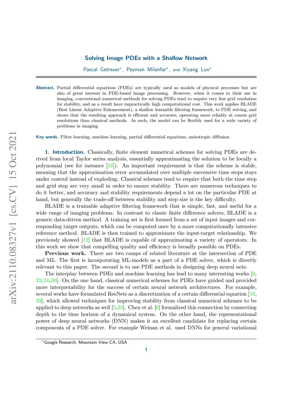 Partial differential equations (PDEs) are typically used as models of physical processes but are also of great interest in PDE-based image processing. However, when it comes to their use in imaging, conventional numerical methods for solving PDEs tend to require very fine grid resolution for stability, and as a result have impractically high computational cost. This work applies BLADE (Best Linear Adaptive Enhancement), a shallow learnable filtering framework, to PDE solving, and shows that the resulting approach is efficient and accurate, operating more reliably at coarse grid resolutions than classical methods. As such, the model can be flexibly used for a wide variety of problems in imaging.