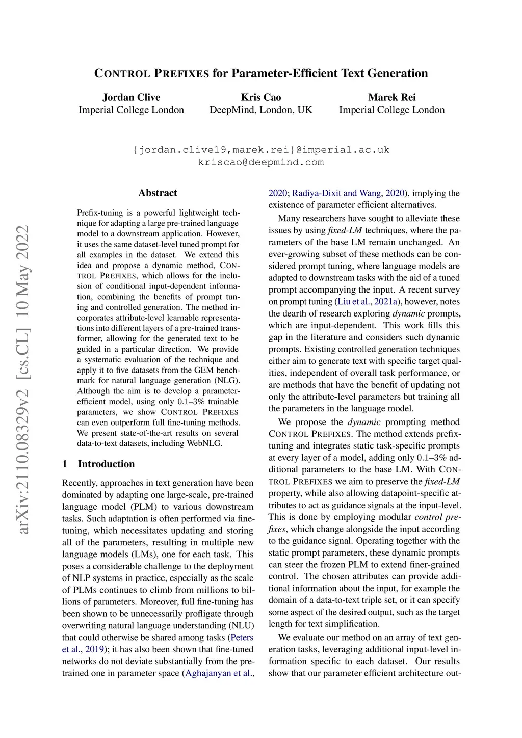 Prefix-tuning is a powerful lightweight technique for adapting a large pre-trained language model to a downstream application. However, it uses the same dataset-level tuned prompt for all examples in the dataset. We extend this idea and propose a dynamic method, Control Prefixes, which allows for the inclusion of conditional input-dependent information, combining the benefits of prompt tuning and controlled generation. The method incorporates attribute-level learnable representations into different layers of a pre-trained transformer, allowing for the generated text to be guided in a particular direction. We provide a systematic evaluation of the technique and apply it to five datasets from the GEM benchmark for natural language generation (NLG). Although the aim is to develop a parameter-efficient model, we show Control Prefixes can even outperform full fine-tuning methods. We present state-of-the-art results on several data-to-text datasets, including WebNLG.