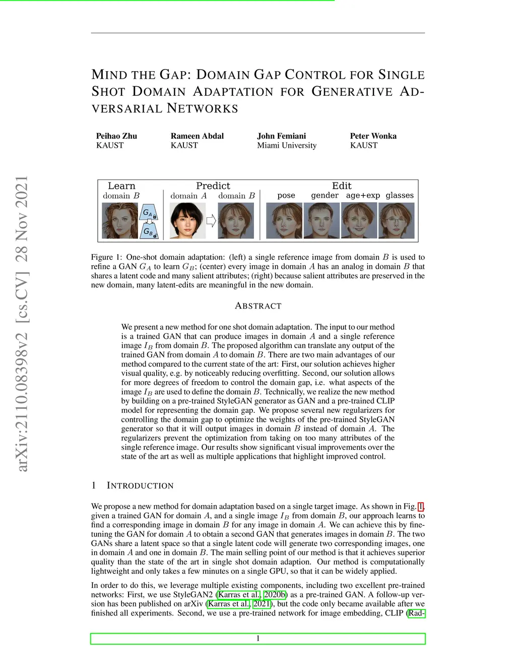 We present a new method for one shot domain adaptation. The input to our method is trained GAN that can produce images in domain A and a single reference image I_B from domain B. The proposed algorithm can translate any output of the trained GAN from domain A to domain B. There are two main advantages of our method compared to the current state of the art: First, our solution achieves higher visual quality, e.g. by noticeably reducing overfitting. Second, our solution allows for more degrees of freedom to control the domain gap, i.e. what aspects of image I_B are used to define the domain B. Technically, we realize the new method by building on a pre-trained StyleGAN generator as GAN and a pre-trained CLIP model for representing the domain gap. We propose several new regularizers for controlling the domain gap to optimize the weights of the pre-trained StyleGAN generator to output images in domain B instead of domain A. The regularizers prevent the optimization from taking on too many attributes of the single reference image. Our results show significant visual improvements over the state of the art as well as multiple applications that highlight improved control.