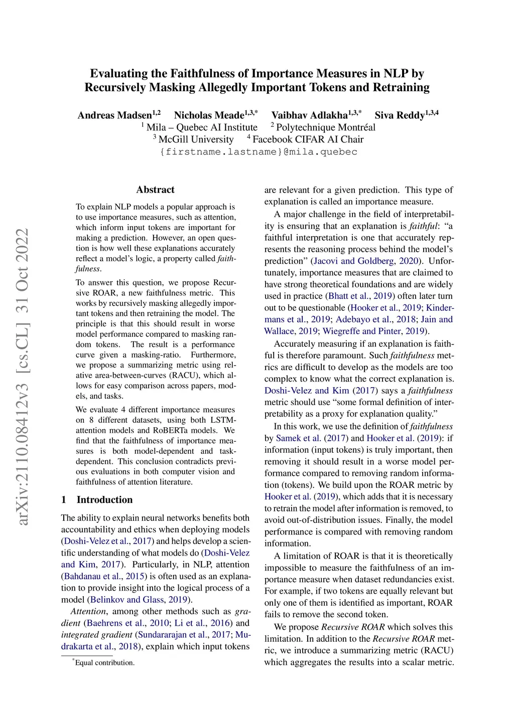 To explain NLP models a popular approach is to use importance measures, such as attention, which inform input tokens are important for making a prediction. However, an open question is how well these explanations accurately reflect a model's logic, a property called faithfulness. To answer this question, we propose Recursive ROAR, a new faithfulness metric. This works by recursively masking allegedly important tokens and then retraining the model. The principle is that this should result in worse model performance compared to masking random tokens. The result is a performance curve given a masking-ratio. Furthermore, we propose a summarizing metric using relative area-between-curves (RACU), which allows for easy comparison across papers, models, and tasks. We evaluate 4 different importance measures on 8 different datasets, using both LSTM-attention models and RoBERTa models. We find that the faithfulness of importance measures is both model-dependent and task-dependent. This conclusion contradicts previous evaluations in both computer vision and faithfulness of attention literature.