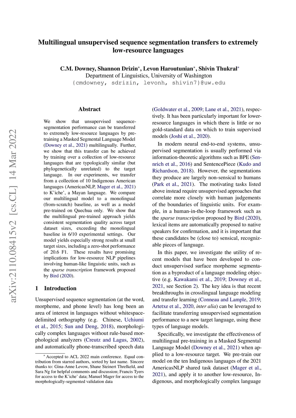 We show that unsupervised sequence-segmentation performance can be transferred to extremely low-resource languages by pre-training a Masked Segmental Language Model (Downey et al., 2021) multilingually. Further, we show that this transfer can be achieved by training over a collection of low-resource languages that are typologically similar (but phylogenetically unrelated) to the target language. In our experiments, we transfer from a collection of 10 Indigenous American languages (AmericasNLP, Mager et al., 2021) to Kíche', a Mayan language. We compare our multilingual model to a monolingual (from-scratch) baseline, as well as a model pre-trained on Quechua only. We show that the multilingual pre-trained approach yields consistent segmentation quality across target dataset sizes, exceeding the monolingual baseline in 6/10 experimental settings. Our model yields especially strong results at small target sizes, including a zero-shot performance of 20.6 F1. These results have promising implications for low-resource NLP pipelines involving human-like linguistic units, such as the sparse transcription framework proposed by Bird (2020).