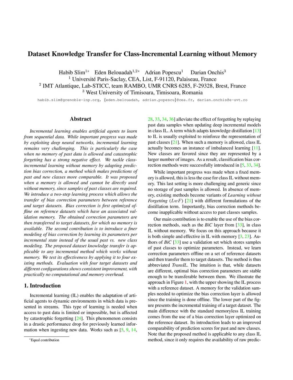 Dataset Knowledge Transfer for Class-Incremental Learning without Memory