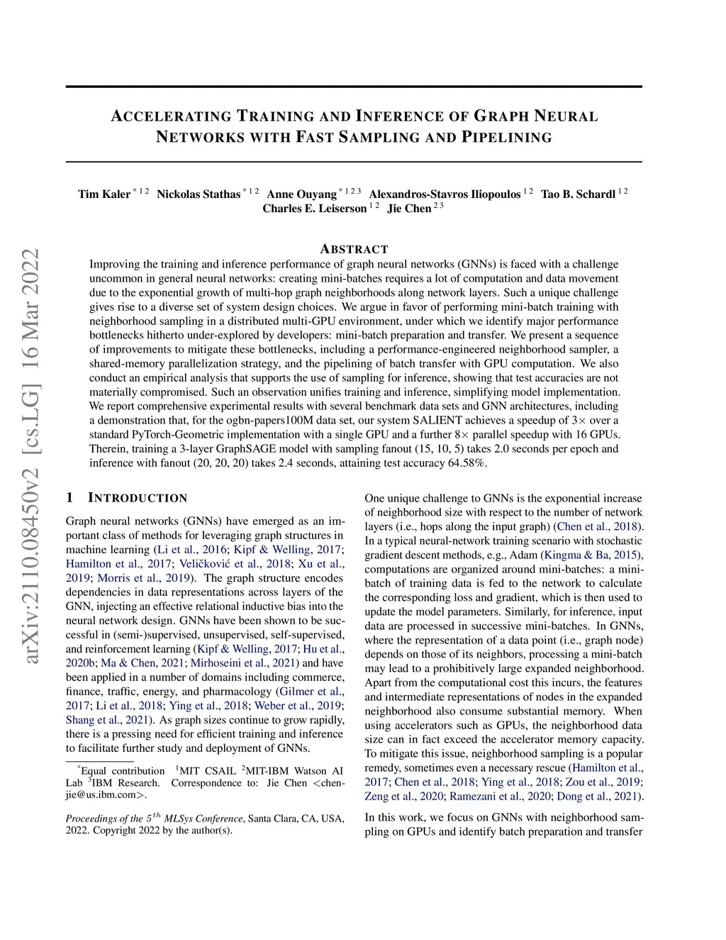 Improving the training and inference performance of graph neural networks (GNNs) is faced with a challenge uncommon in general neural networks: creating mini-batches requires a lot of computation and data movement due to the exponential growth of multi-hop graph neighborhoods along network layers. Such a unique challenge gives rise to a diverse set of system design choices. We argue in favor of performing mini-batch training with neighborhood sampling in a distributed multi-GPU environment, under which we identify major performance bottlenecks hitherto under-explored by developers: mini-batch preparation and transfer. We present a sequence of improvements to mitigate these bottlenecks, including a performance-engineered neighborhood sampler, a shared-memory parallelization strategy, and the pipelining of batch transfer with GPU computation. We also conduct an empirical analysis that supports the use of sampling for inference, showing that test accuracies are not materially compromised. Such an observation unifies training and inference, simplifying model implementation. We report comprehensive experimental results with several benchmark data sets and GNN architectures, including a demonstration that, for the ogbn-papers100M data set, our system SALIENT achieves a speedup of 3x over a standard PyTorch-Geometric implementation with a single GPU and a further 8x parallel speedup with 16 GPUs. Therein, training a 3-layer GraphSAGE model with sampling fanout (15, 10, 5) takes 2.0 seconds per epoch and inference with fanout (20, 20, 20) takes 2.4 seconds, attaining test accuracy 64.58%.