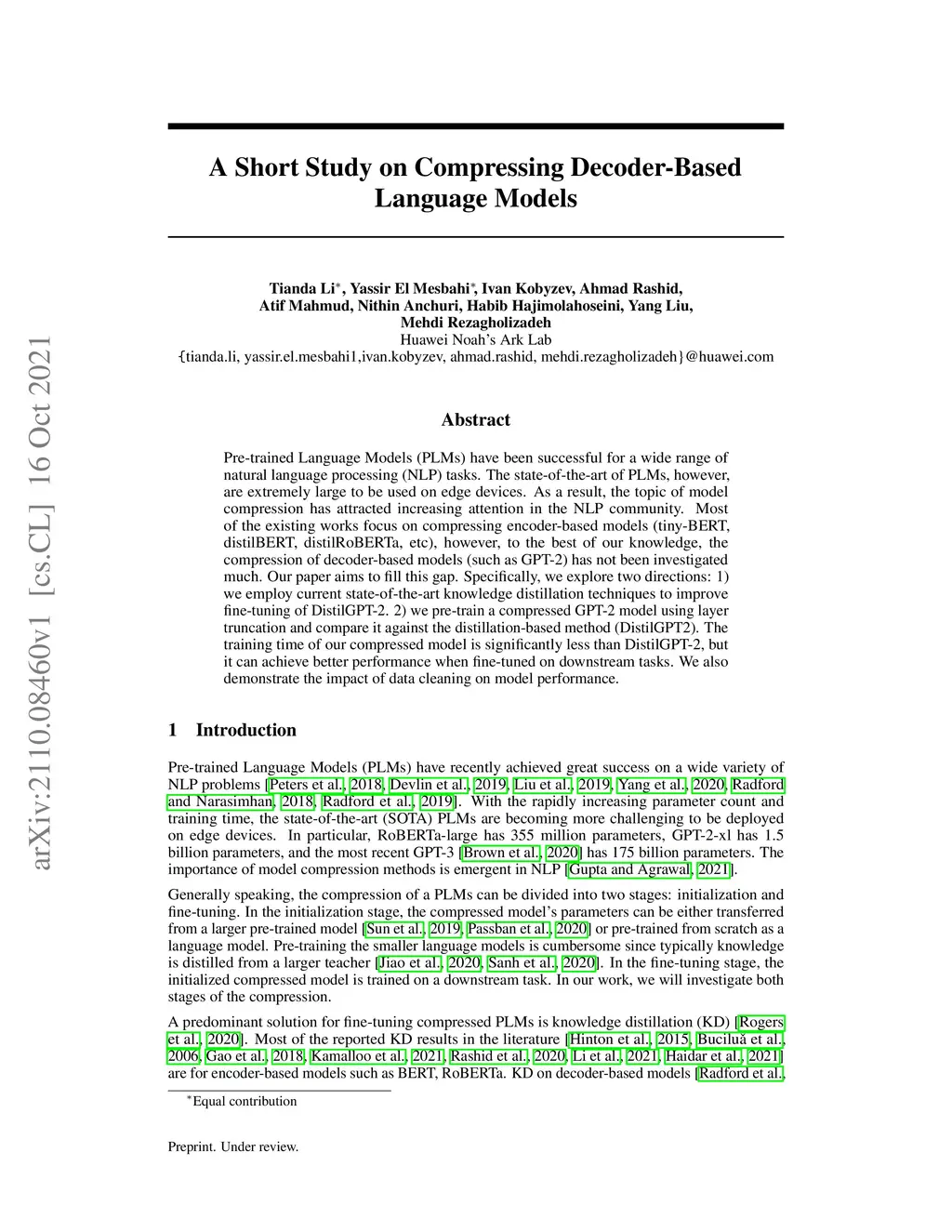 Pre-trained Language Models (PLMs) have been successful for a wide range of natural language processing (NLP) tasks. The state-of-the-art of PLMs, however, are extremely large to be used on edge devices. As a result, the topic of model compression has attracted increasing attention in the NLP community. Most of the existing works focus on compressing encoder-based models (tiny-BERT, distilBERT, distilRoBERTa, etc), however, to the best of our knowledge, the compression of decoder-based models (such as GPT-2) has not been investigated much. Our paper aims to fill this gap. Specifically, we explore two directions: 1) we employ current state-of-the-art knowledge distillation techniques to improve fine-tuning of DistilGPT-2. 2) we pre-train a compressed GPT-2 model using layer truncation and compare it against the distillation-based method (DistilGPT2). The training time of our compressed model is significantly less than DistilGPT-2, but it can achieve better performance when fine-tuned on downstream tasks. We also demonstrate the impact of data cleaning on model performance.