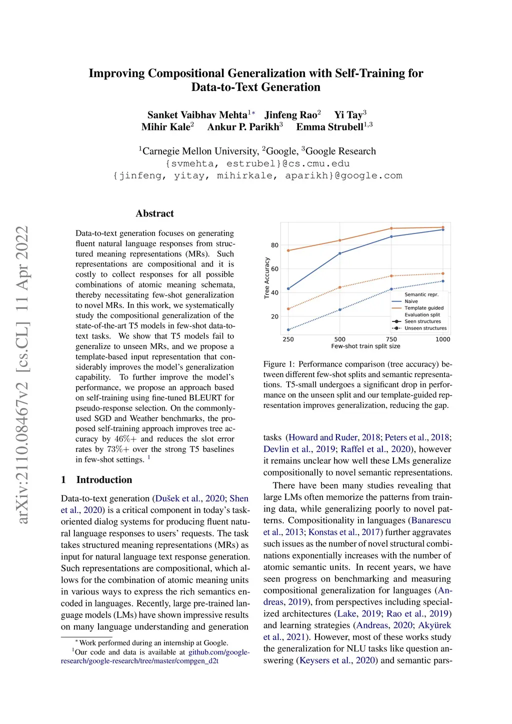 Data-to-text generation focuses on generating fluent natural language responses from structured meaning representations (MRs). Such representations are compositional and it is costly to collect responses for all possible combinations of atomic meaning schemata, thereby necessitating few-shot generalization to novel MRs. In this work, we systematically study the compositional generalization of the state-of-the-art T5 models in few-shot data-to-text tasks. We show that T5 models fail to generalize to unseen MRs, and we propose a template-based input representation that considerably improves the model's generalization capability. To further improve the model's performance, we propose an approach based on self-training using fine-tuned BLEURT for pseudo response selection. On the commonly-used SGD and Weather benchmarks, the proposed self-training approach improves tree accuracy by 46%+ and reduces the slot error rates by 73%+ over the strong T5 baselines in few-shot settings.