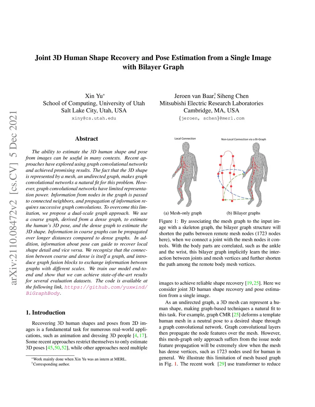 The ability to estimate the 3D human shape and pose from images can be useful in many contexts. Recent approaches have explored using graph convolutional networks and achieved promising results. The fact that the 3D shape is represented by a mesh, an undirected graph, makes graph convolutional networks a natural fit for this problem. However, graph convolutional networks have limited representation power. Information from nodes in the graph is passed to connected neighbors, and propagation of information requires successive graph convolutions. To overcome this limitation, we propose a dual-scale graph approach. We use a coarse graph, derived from a dense graph, to estimate the human's 3D pose, and the dense graph to estimate the 3D shape. Information in coarse graphs can be propagated over longer distances compared to dense graphs. In addition, information about pose can guide to recover local shape detail and vice versa. We recognize that the connection between coarse and dense is itself a graph, and introduce graph fusion blocks to exchange information between graphs with different scales. We train our model end-to-end and show that we can achieve state-of-the-art results for several evaluation datasets.