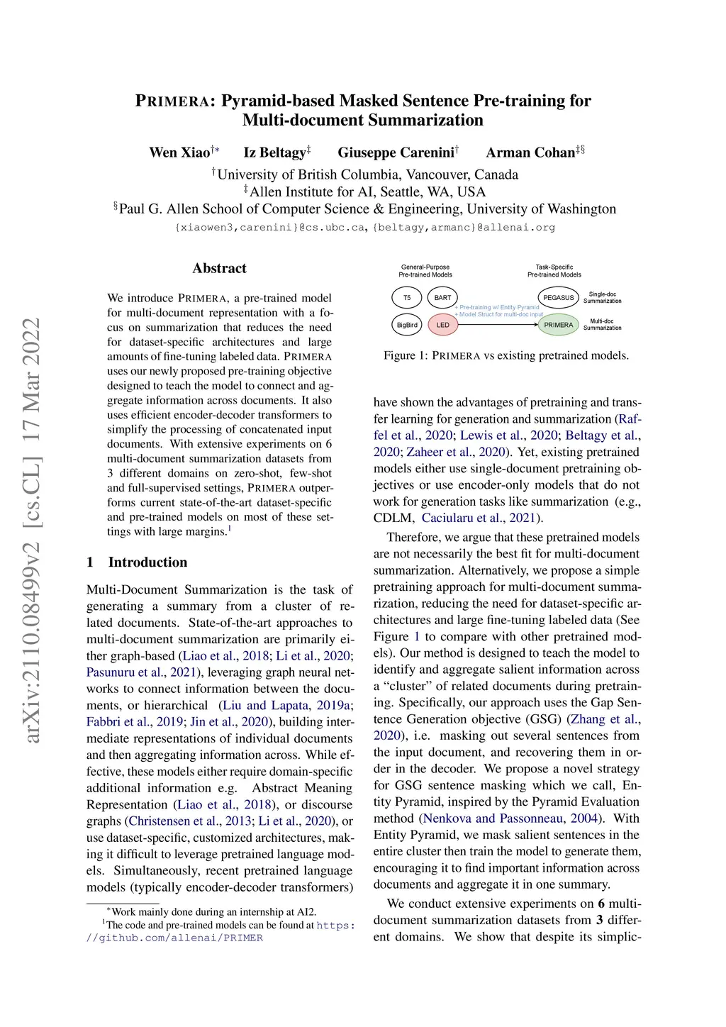 PRIMERA: Pyramid-based Masked Sentence Pre-training for Multi-document