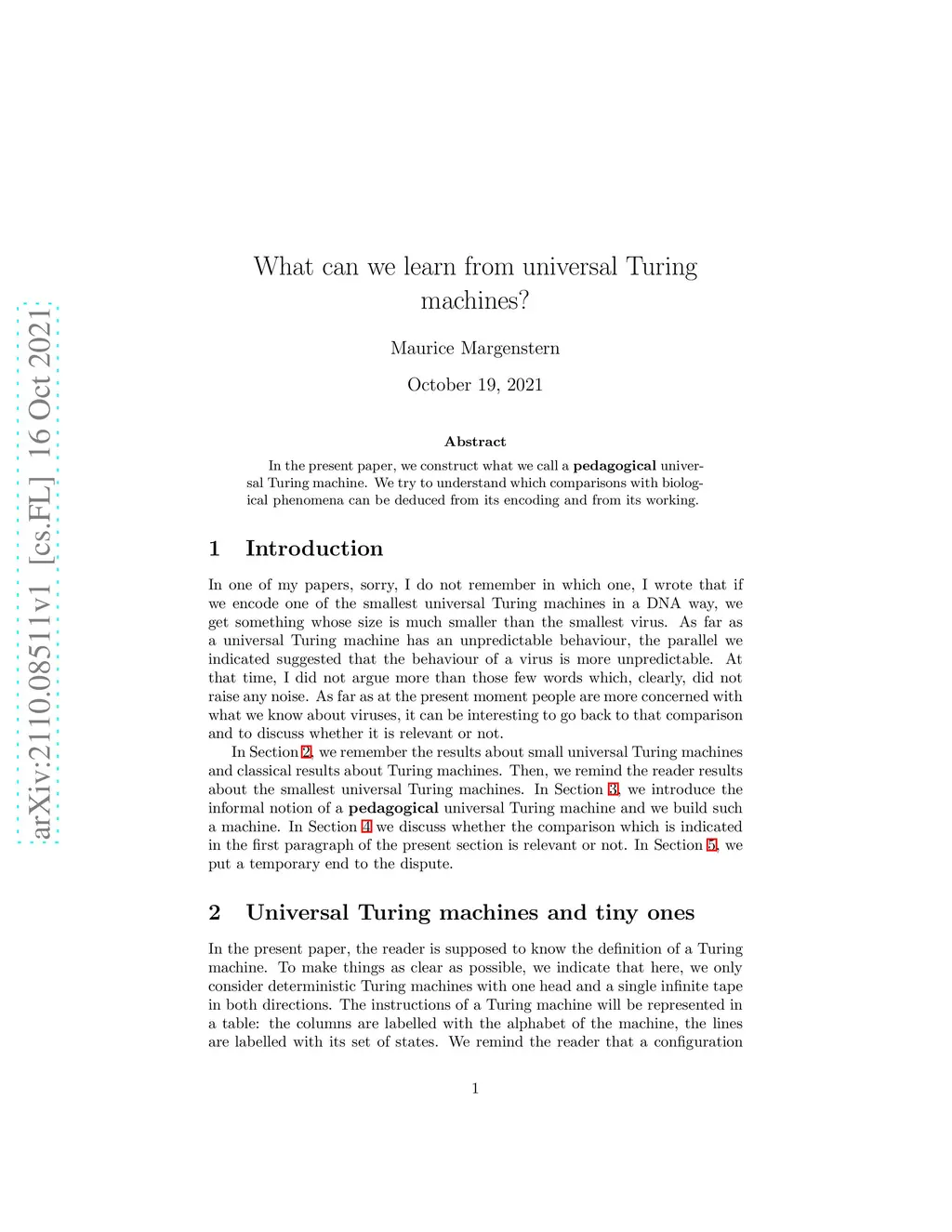 In the present paper, we construct what we call a pedagogical universal Turing machine. We try to understand which comparisons with biological phenomena can be deduced from its encoding and from its working.