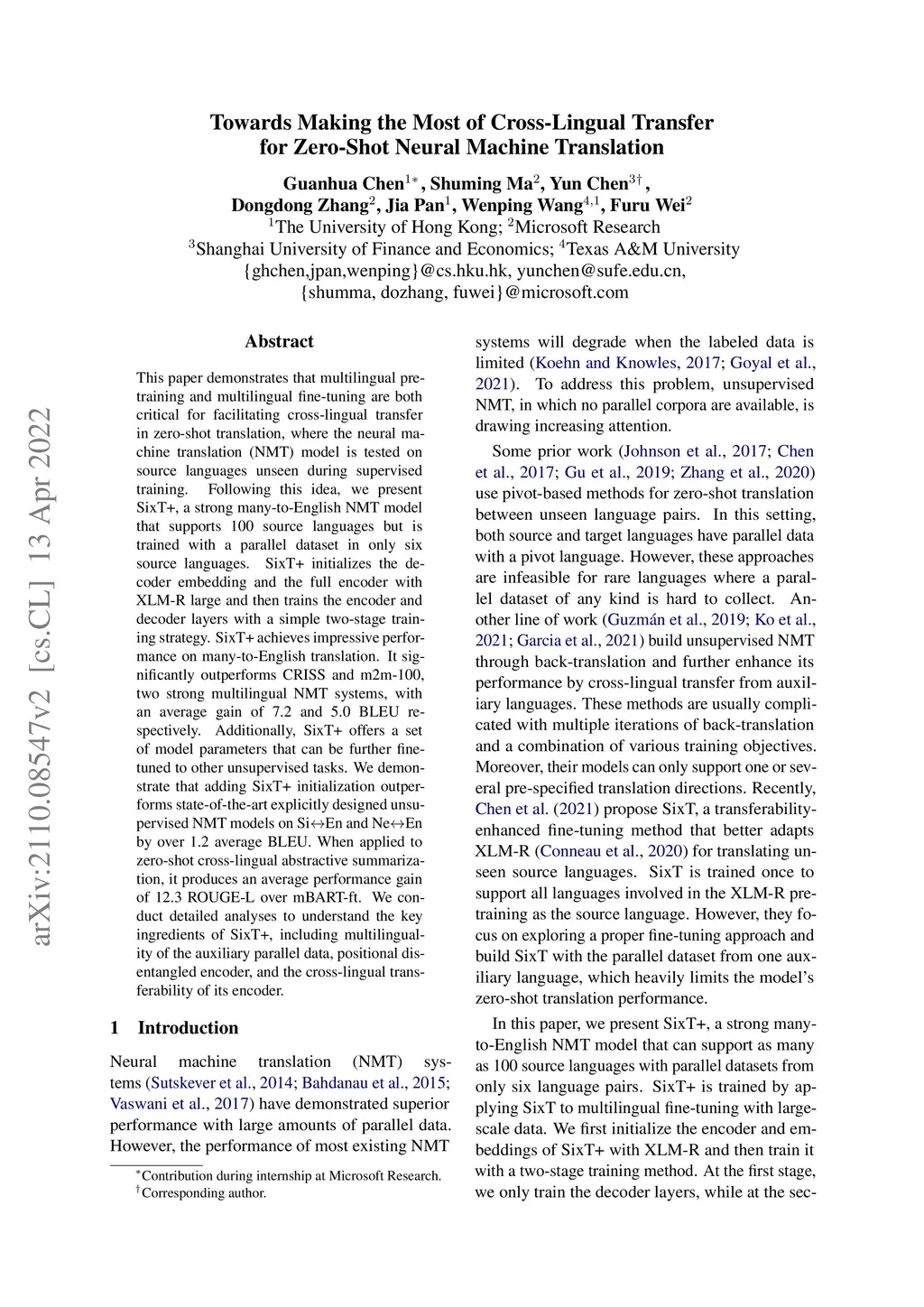 This paper demonstrates that multilingual pretraining and multilingual fine-tuning are both critical for facilitating cross-lingual transfer in zero-shot translation, where the neural machine translation (NMT) model is tested on source languages unseen during supervised training. Following this idea, we present SixT+, a strong many-to-English NMT model that supports 100 source languages but is trained with a parallel dataset in only six source languages. SixT+ initializes the decoder embedding and the full encoder with XLM-R large and then trains the encoder and decoder layers with a simple two-stage training strategy. SixT+ achieves impressive performance on many-to-English translation. It significantly outperforms CRISS and m2m-100, two strong multilingual NMT systems, with an average gain of 7.2 and 5.0 BLEU respectively. Additionally, SixT+ offers a set of model parameters that can be further fine-tuned to other unsupervised tasks. We demonstrate that adding SixT+ initialization outperforms state-of-the-art explicitly designed unsupervised NMT models on Si<->En and Ne<->En by over 1.2 average BLEU. When applied to zero-shot cross-lingual abstractive summarization, it produces an average performance gain of 12.3 ROUGE-L over mBART-ft. We conduct detailed analyses to understand the key ingredients of SixT+, including multilinguality of the auxiliary parallel data, positional disentangled encoder, and the cross-lingual transferability of its encoder.