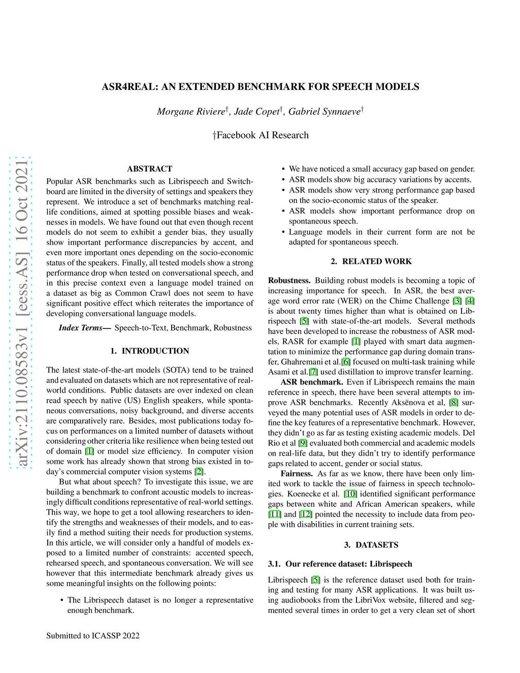 Popular ASR benchmarks such as Librispeech and Switchboard are limited in the diversity of settings and speakers they represent. We introduce a set of benchmarks matching real-life conditions, aimed at spotting possible biases and weaknesses in models. We have found out that even though recent models do not seem to exhibit a gender bias, they usually show important performance discrepancies by accent, and even more important ones depending on the socio-economic status of the speakers. Finally, all tested models show a strong performance drop when tested on conversational speech, and in this precise context even a language model trained on a dataset as big as Common Crawl does not seem to have significant positive effect which reiterates the importance of developing conversational language models