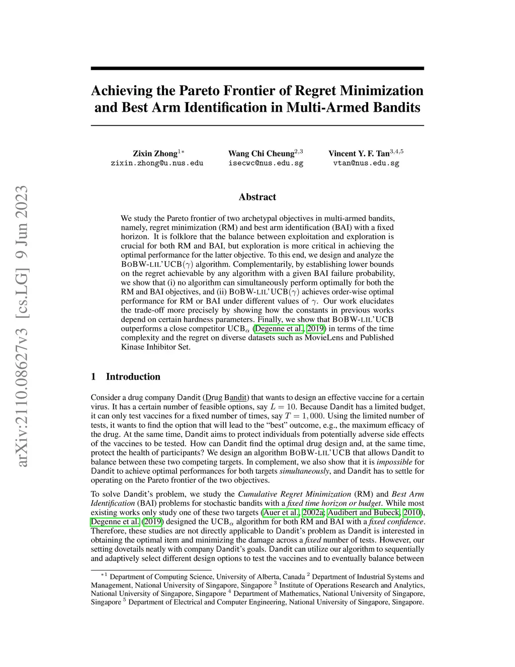 We study the Pareto frontier of two archetypal objectives in multi-armed bandits, namely, regret minimization (RM) and best arm identification (BAI) with a fixed horizon. It is folklore that the balance between exploitation and exploration is crucial for both RM and BAI, but exploration is more critical in achieving the optimal performance for the latter objective. To this end, we design and analyze the BoBW-lilÚCB algorithm. Complementarily, by establishing lower bounds on the regret achievable by any algorithm with a given BAI failure probability, we show that (i) no algorithm can simultaneously perform optimally for both the RM and BAI objectives, and (ii) BoBW-lilÚCB achieves order-wise optimal performance for RM or BAI under different values of . Our work elucidates the trade-off more precisely by showing how the constants in previous works depend on certain hardness parameters. Finally, we show that BoBW-lilÚCB outperforms a close competitor UCB (Degenne et al., 2019) in terms of the time complexity and the regret on diverse datasets such as MovieLens and Published Kinase Inhibitor Set.