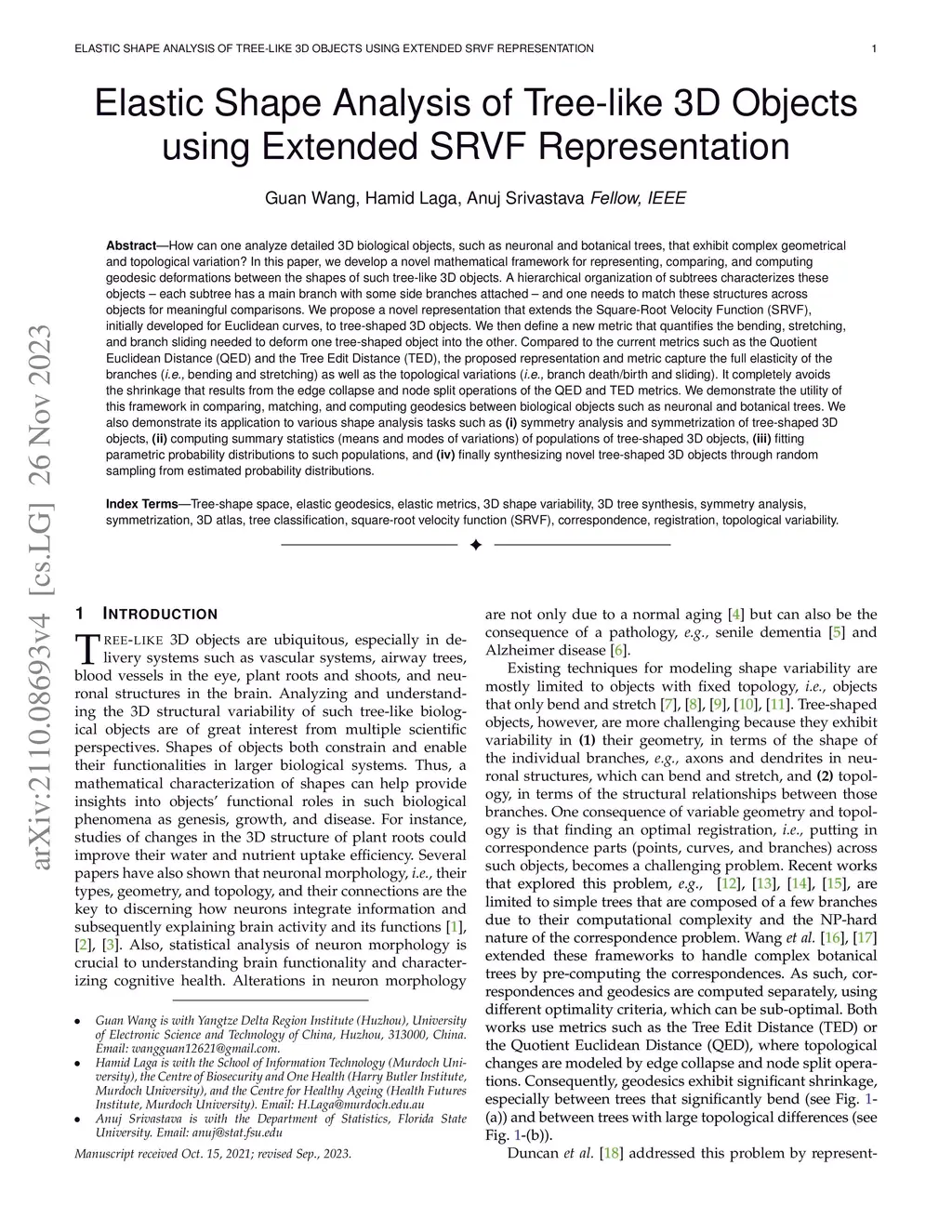 How can one analyze detailed 3D biological objects, such as neurons and botanical trees, that exhibit complex geometrical and topological variation? In this paper, we develop a novel mathematical framework for representing, comparing, and computing geodesic deformations between the shapes of such tree-like 3D objects. A hierarchical organization of subtrees characterizes these objects -- each subtree has the main branch with some side branches attached -- and one needs to match these structures across objects for meaningful comparisons. We propose a novel representation that extends the Square-Root Velocity Function (SRVF), initially developed for Euclidean curves, to tree-shaped 3D objects. We then define a new metric that quantifies the bending, stretching, and branch sliding needed to deform one tree-shaped object into the other. Compared to the current metrics, such as the Quotient Euclidean Distance (QED) and the Tree Edit Distance (TED), the proposed representation and metric capture the full elasticity of the branches (i.e., bending and stretching) as well as the topological variations (i.e., branch death/birth and sliding). It completely avoids the shrinkage that results from the edge collapse and node split operations of the QED and TED metrics. We demonstrate the utility of this framework in comparing, matching, and computing geodesics between biological objects such as neurons and botanical trees. The framework is also applied to various shape analysis tasks: (i) symmetry analysis and symmetrization of tree-shaped 3D objects, (ii) computing summary statistics (means and modes of variations) of populations of tree-shaped 3D objects, (iii) fitting parametric probability distributions to such populations, and (iv) finally synthesizing novel tree-shaped 3D objects through random sampling from estimated probability distributions.