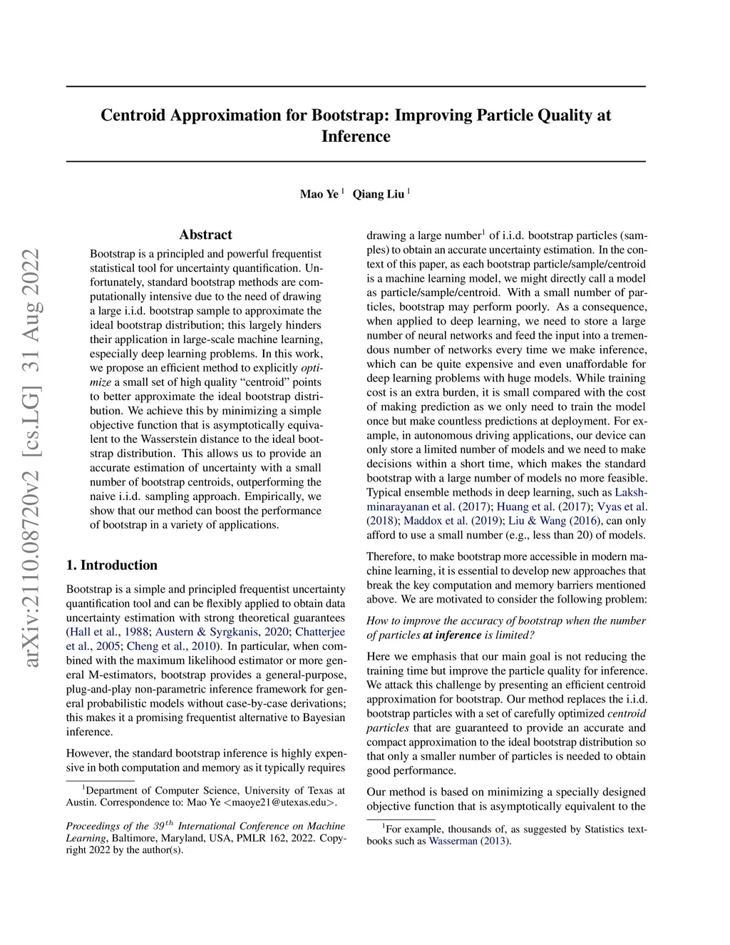 Bootstrap is a principled and powerful frequentist statistical tool for uncertainty quantification. Unfortunately, standard bootstrap methods are computationally intensive due to the need of drawing a large i.i.d. bootstrap sample to approximate the ideal bootstrap distribution; this largely hinders their application in large-scale machine learning, especially deep learning problems. In this work, we propose an efficient method to explicitly \emph{optimize} a small set of high quality ``centroid'' points to better approximate the ideal bootstrap distribution. We achieve this by minimizing a simple objective function that is asymptotically equivalent to the Wasserstein distance to the ideal bootstrap distribution. This allows us to provide an accurate estimation of uncertainty with a small number of bootstrap centroids, outperforming the naive i.i.d. sampling approach. Empirically, we show that our method can boost the performance of bootstrap in a variety of applications.