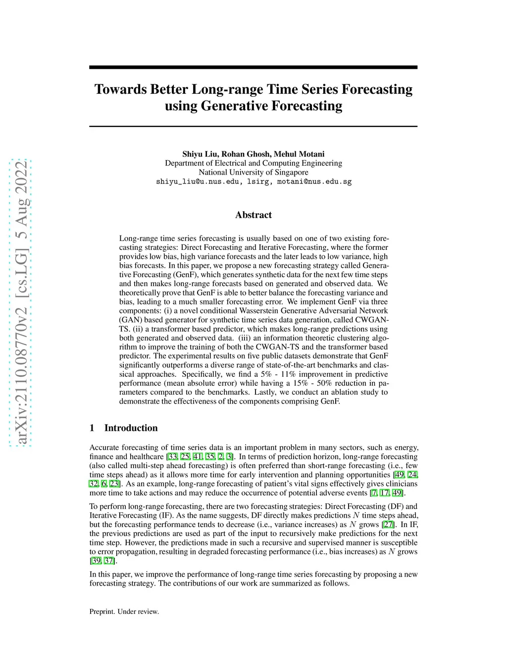 Long-range time series forecasting is usually based on one of two existing forecasting strategies: Direct Forecasting and Iterative Forecasting, where the former provides low bias, high variance forecasts and the later leads to low variance, high bias forecasts. In this paper, we propose a new forecasting strategy called Generative Forecasting (GenF), which generates synthetic data for the next few time steps and then makes long-range forecasts based on generated and observed data. We theoretically prove that GenF is able to better balance the forecasting variance and bias, leading to a much smaller forecasting error. We implement GenF via three components: (i) a novel conditional Wasserstein Generative Adversarial Network (GAN) based generator for synthetic time series data generation, called CWGAN-TS. (ii) a transformer based predictor, which makes long-range predictions using both generated and observed data. (iii) an information theoretic clustering algorithm to improve the training of both the CWGAN-TS and the transformer based predictor. The experimental results on five public datasets demonstrate that GenF significantly outperforms a diverse range of state-of-the-art benchmarks and classical approaches. Specifically, we find a 5% - 11% improvement in predictive performance (mean absolute error) while having a 15% - 50% reduction in parameters compared to the benchmarks. Lastly, we conduct an ablation study to demonstrate the effectiveness of the components comprising GenF.