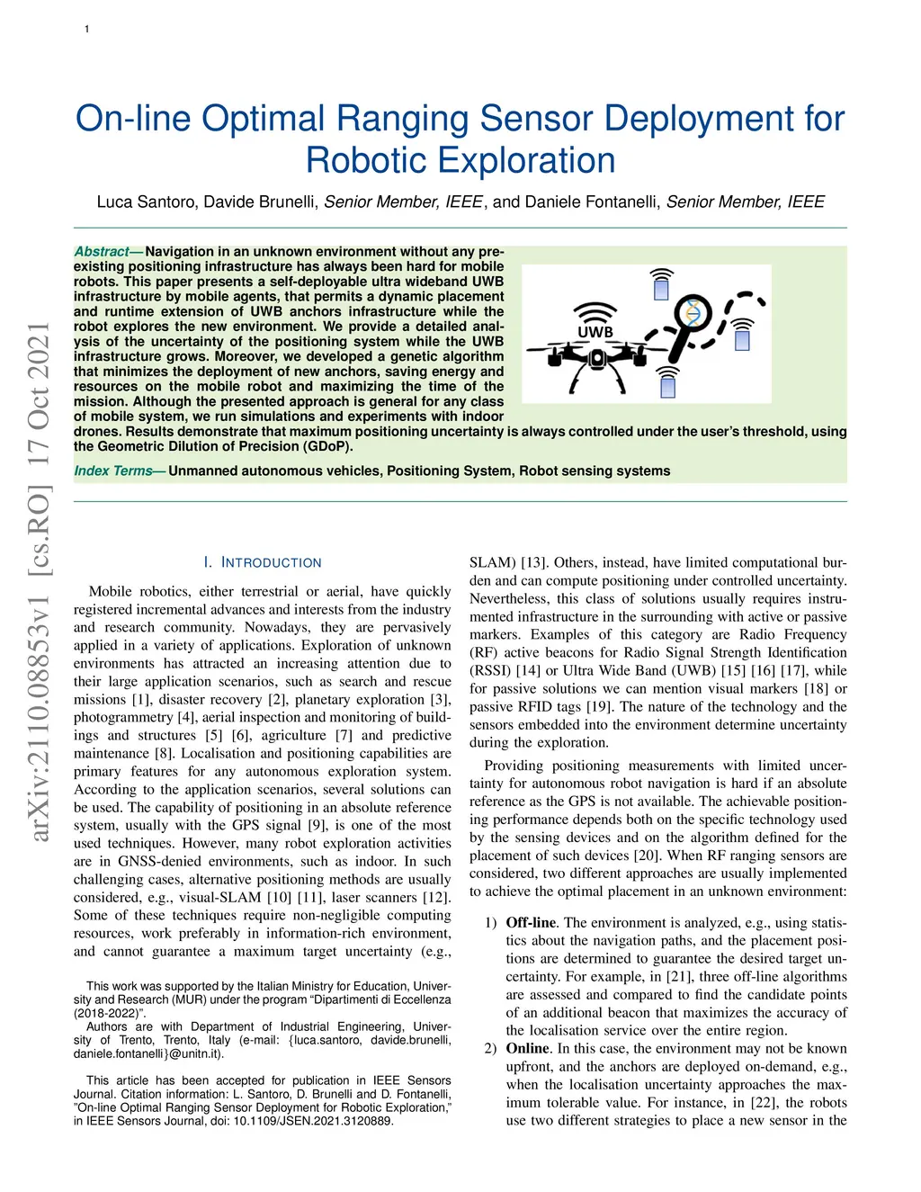 Navigation in an unknown environment without any preexisting positioning infrastructure has always been hard for mobile robots. This paper presents a self-deployable ultra wideband UWB infrastructure by mobile agents, that permits a dynamic placement and runtime extension of UWB anchors infrastructure while the robot explores the new environment. We provide a detailed analysis of the uncertainty of the positioning system while the UWB infrastructure grows. Moreover, we developed a genetic algorithm that minimizes the deployment of new anchors, saving energy and resources on the mobile robot and maximizing the time of the mission. Although the presented approach is general for any class of mobile system, we run simulations and experiments with indoor drones. Results demonstrate that maximum positioning uncertainty is always controlled under the user's threshold, using the Geometric Dilution of Precision (GDoP).