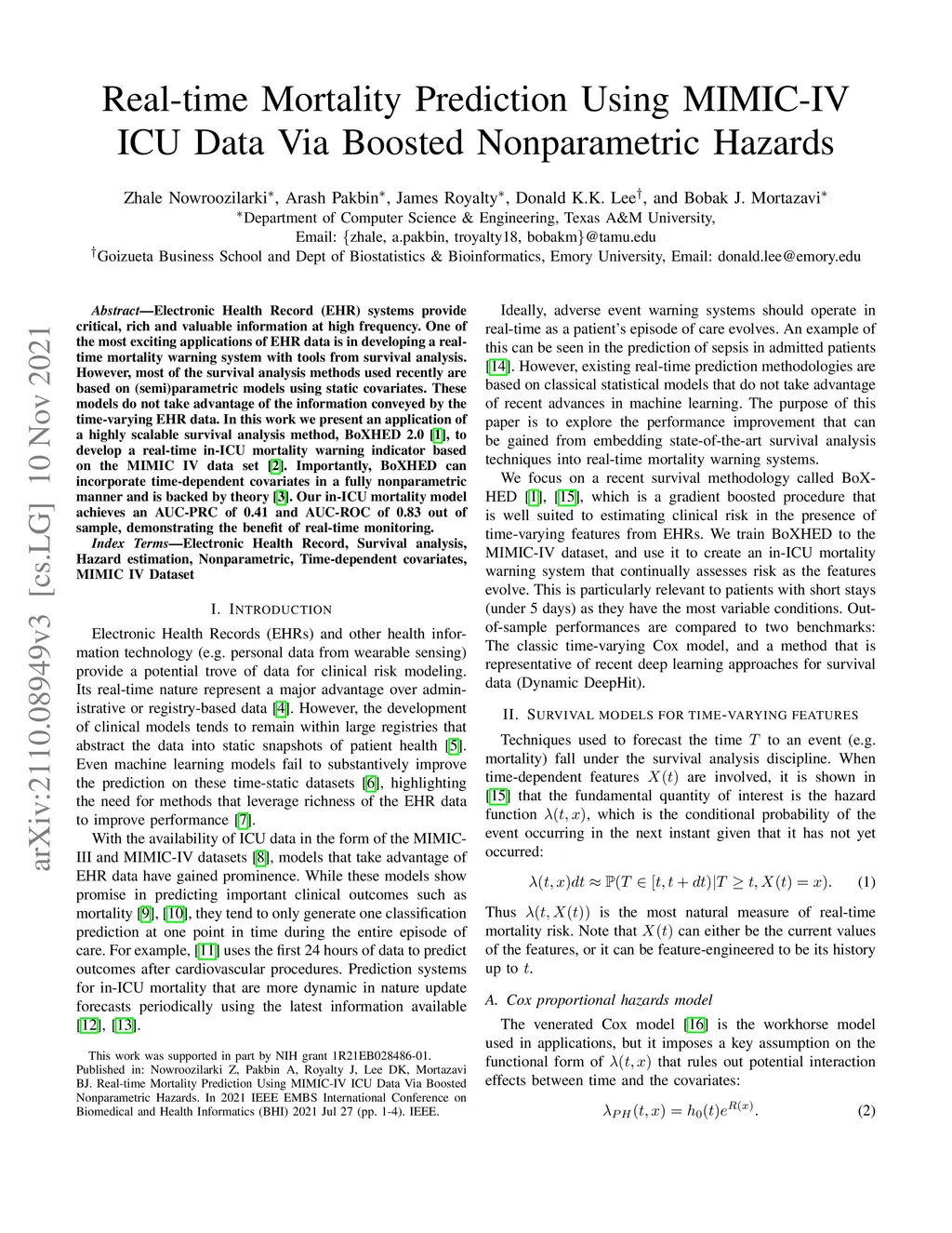 Electronic Health Record (EHR) systems provide critical, rich and valuable information at high frequency. One of the most exciting applications of EHR data is in developing a real-time mortality warning system with tools from survival analysis. However, most of the survival analysis methods used recently are based on (semi)parametric models using static covariates. These models do not take advantage of the information conveyed by the time-varying EHR data. In this work, we present an application of a highly scalable survival analysis method, BoXHED 2.0 to develop a real-time in-ICU mortality warning indicator based on the MIMIC IV data set. Importantly, BoXHED can incorporate time-dependent covariates in a fully nonparametric manner and is backed by theory. Our in-ICU mortality model achieves an AUC-PRC of 0.41 and AUC-ROC of 0.83 out of sample, demonstrating the benefit of real-time monitoring.