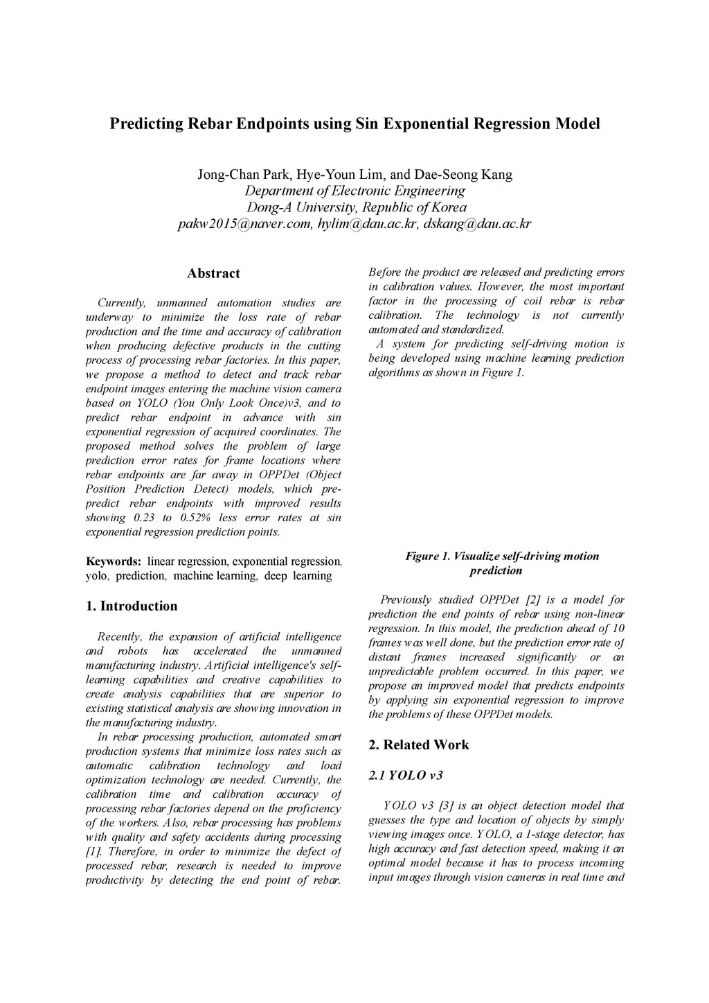 Currently, unmanned automation studies are underway to minimize the loss rate of rebar production and the time and accuracy of calibration when producing defective products in the cutting process of processing rebar factories. In this paper, we propose a method to detect and track rebar endpoint images entering the machine vision camera based on YOLO (You Only Look Once)v3, and to predict rebar endpoint in advance with sin exponential regression of acquired coordinates. The proposed method solves the problem of large prediction error rates for frame locations where rebar endpoints are far away in OPPDet (Object Position Prediction Detect) models, which prepredict rebar endpoints with improved results showing 0.23 to 0.52% less error rates at sin exponential regression prediction points.