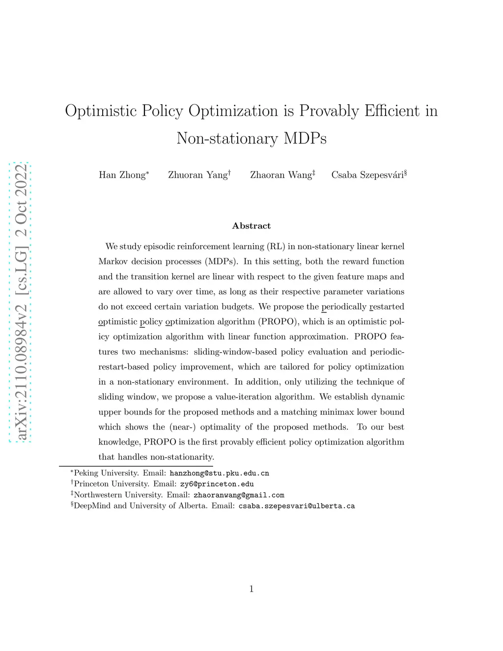 We study episodic reinforcement learning (RL) in non-stationary linear kernel Markov decision processes (MDPs). In this setting, both the reward function and the transition kernel are linear with respect to the given feature maps and are allowed to vary over time, as long as their respective parameter variations do not exceed certain variation budgets. We propose the eriodically estarted ptimistic olicy ptimization algorithm (PROPO), which is an optimistic policy optimization algorithm with linear function approximation. PROPO features two mechanisms: sliding-window-based policy evaluation and periodic-restart-based policy improvement, which are tailored for policy optimization in a non-stationary environment. In addition, only utilizing the technique of sliding window, we propose a value-iteration algorithm. We establish dynamic upper bounds for the proposed methods and a matching minimax lower bound which shows the (near-) optimality of the proposed methods. To our best knowledge, PROPO is the first provably efficient policy optimization algorithm that handles non-stationarity.
