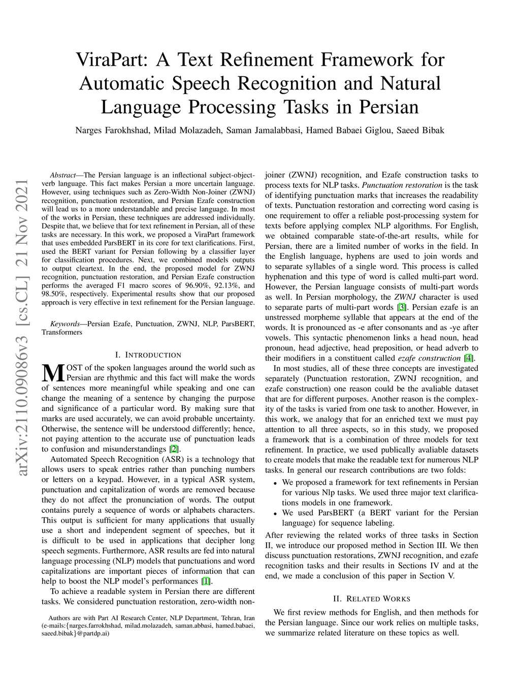 The Persian language is an inflectional subject-object-verb language. This fact makes Persian a more uncertain language. However, using techniques such as Zero-Width Non-Joiner (ZWNJ) recognition, punctuation restoration, and Persian Ezafe construction will lead us to a more understandable and precise language. In most of the works in Persian, these techniques are addressed individually. Despite that, we believe that for text refinement in Persian, all of these tasks are necessary. In this work, we proposed a ViraPart framework that uses embedded ParsBERT in its core for text clarifications. First, used the BERT variant for Persian following by a classifier layer for classification procedures. Next, we combined models outputs to output cleartext. In the end, the proposed model for ZWNJ recognition, punctuation restoration, and Persian Ezafe construction performs the averaged F1 macro scores of 96.90%, 92.13%, and 98.50%, respectively. Experimental results show that our proposed approach is very effective in text refinement for the Persian language.