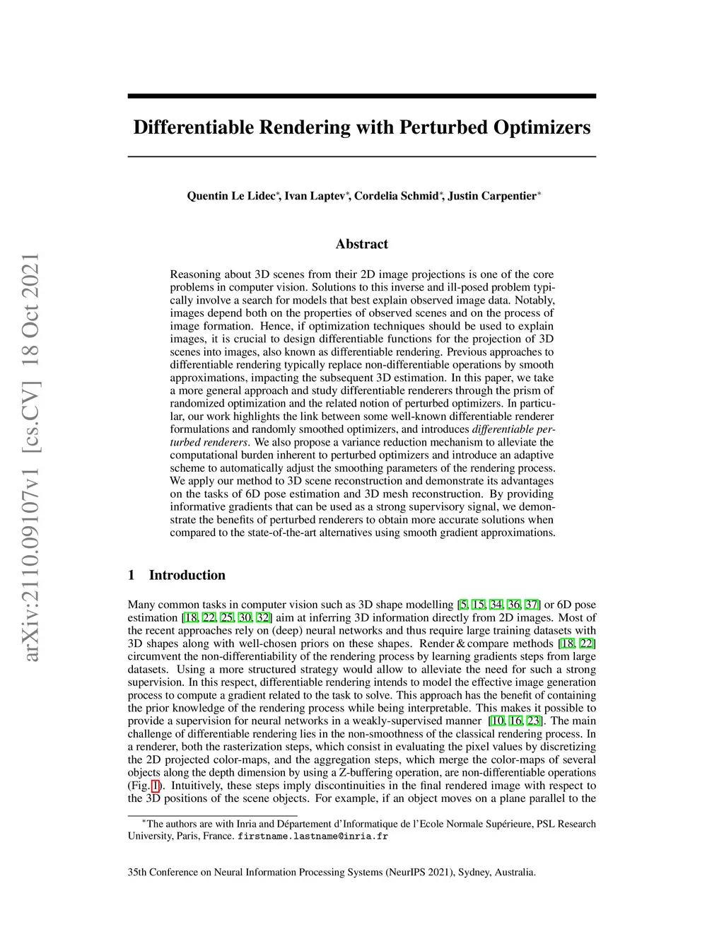 Reasoning about 3D scenes from their 2D image projections is one of the core problems in computer vision. Solutions to this inverse and ill-posed problem typically involve a search for models that best explain observed image data. Notably, images depend both on the properties of observed scenes and on the process of image formation. Hence, if optimization techniques should be used to explain images, it is crucial to design differentiable functions for the projection of 3D scenes into images, also known as differentiable rendering. Previous approaches to differentiable rendering typically replace non-differentiable operations by smooth approximations, impacting the subsequent 3D estimation. In this paper, we take a more general approach and study differentiable renderers through the prism of randomized optimization and the related notion of perturbed optimizers. In particular, our work highlights the link between some well-known differentiable renderer formulations and randomly smoothed optimizers, and introduces differentiable perturbed renderers. We also propose a variance reduction mechanism to alleviate the computational burden inherent to perturbed optimizers and introduce an adaptive scheme to automatically adjust the smoothing parameters of the rendering process. We apply our method to 3D scene reconstruction and demonstrate its advantages on the tasks of 6D pose estimation and 3D mesh reconstruction. By providing informative gradients that can be used as a strong supervisory signal, we demonstrate the benefits of perturbed renderers to obtain more accurate solutions when compared to the state-of-the-art alternatives using smooth gradient approximations.