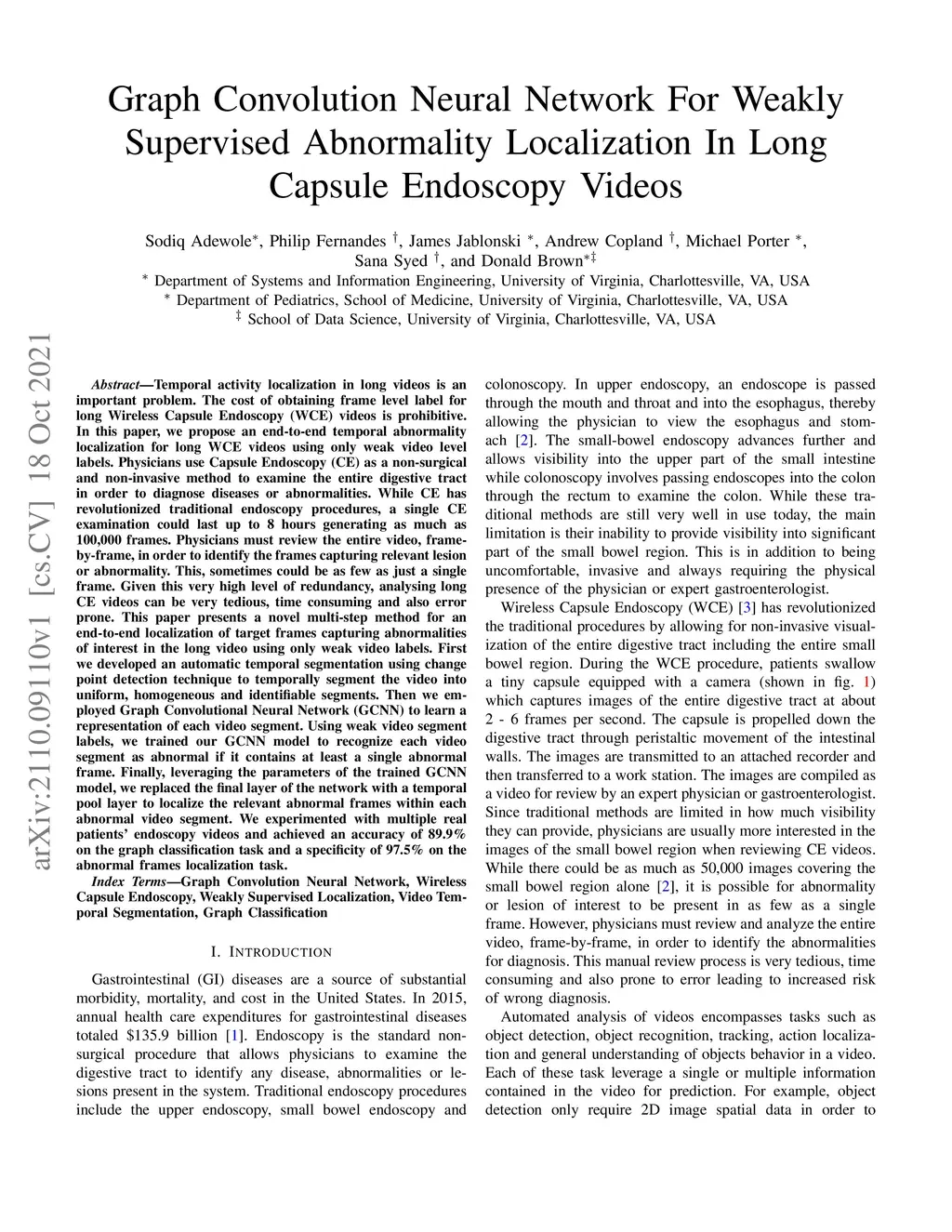 Temporal activity localization in long videos is an important problem. The cost of obtaining frame level label for long Wireless Capsule Endoscopy (WCE) videos is prohibitive. In this paper, we propose an end-to-end temporal abnormality localization for long WCE videos using only weak video level labels. Physicians use Capsule Endoscopy (CE) as a non-surgical and non-invasive method to examine the entire digestive tract in order to diagnose diseases or abnormalities. While CE has revolutionized traditional endoscopy procedures, a single CE examination could last up to 8 hours generating as much as 100,000 frames. Physicians must review the entire video, frame-by-frame, in order to identify the frames capturing relevant abnormality. This, sometimes could be as few as just a single frame. Given this very high level of redundancy, analyzing long CE videos can be very tedious, time consuming and also error prone. This paper presents a novel multi-step method for an end-to-end localization of target frames capturing abnormalities of interest in the long video using only weak video labels. First we developed an automatic temporal segmentation using change point detection technique to temporally segment the video into uniform, homogeneous and identifiable segments. Then we employed Graph Convolutional Neural Network (GCNN) to learn a representation of each video segment. Using weak video segment labels, we trained our GCNN model to recognize each video segment as abnormal if it contains at least a single abnormal frame. Finally, leveraging the parameters of the trained GCNN model, we replaced the final layer of the network with a temporal pool layer to localize the relevant abnormal frames within each abnormal video segment. Our method achieved an accuracy of 89.9\% on the graph classification task and a specificity of 97.5\% on the abnormal frames localization task.