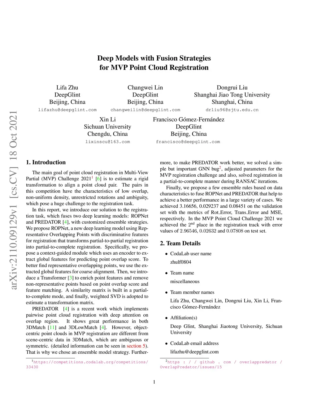 The main goal of point cloud registration in Multi-View Partial (MVP) Challenge 2021 is to estimate a rigid transformation to align a point cloud pair. The pairs in this competition have the characteristics of low overlap, non-uniform density, unrestricted rotations and ambiguity, which pose a huge challenge to the registration task. In this report, we introduce our solution to the registration task, which fuses two deep learning models: ROPNet and PREDATOR, with customized ensemble strategies. Finally, we achieved the second place in the registration track with 2.96546, 0.02632 and 0.07808 under the the metrics of Rot\_Error, Trans\_Error and MSE, respectively.
