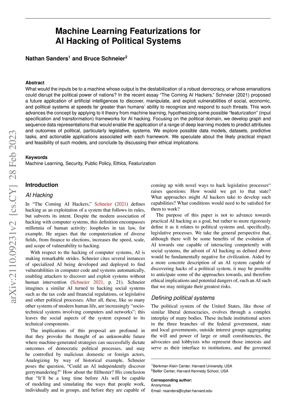 What would the inputs be to a machine whose output is the destabilization of a robust democracy, or whose emanations could disrupt the political power of nations? In the recent essay "The Coming AI Hackers," Schneier (2021) proposed a future application of artificial intelligences to discover, manipulate, and exploit vulnerabilities of social, economic, and political systems at speeds far greater than humans' ability to recognize and respond to such threats. This work advances the concept by applying to it theory from machine learning, hypothesizing some possible "featurization" (input specification and transformation) frameworks for AI hacking. Focusing on the political domain, we develop graph and sequence data representations that would enable the application of a range of deep learning models to predict attributes and outcomes of political, particularly legislative, systems. We explore possible data models, datasets, predictive tasks, and actionable applications associated with each framework. We speculate about the likely practical impact and feasibility of such models, and conclude by discussing their ethical implications.