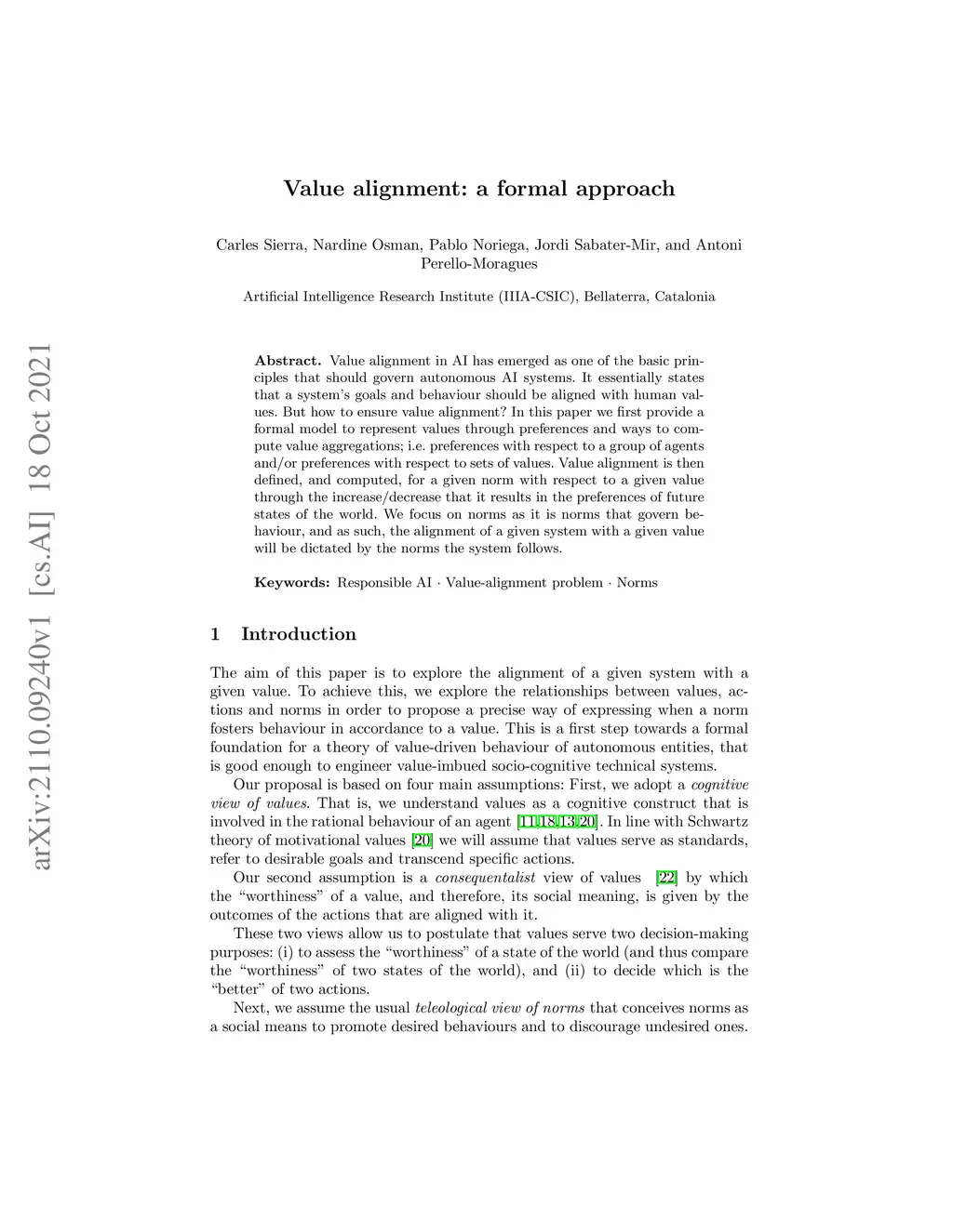 principles that should govern autonomous AI systems. It essentially states that a system's goals and behaviour should be aligned with human values. But how to ensure value alignment? In this paper we first provide a formal model to represent values through preferences and ways to compute value aggregations; i.e. preferences with respect to a group of agents and/or preferences with respect to sets of values. Value alignment is then defined, and computed, for a given norm with respect to a given value through the increase/decrease that it results in the preferences of future states of the world. We focus on norms as it is norms that govern behaviour, and as such, the alignment of a given system with a given value will be dictated by the norms the system follows.
