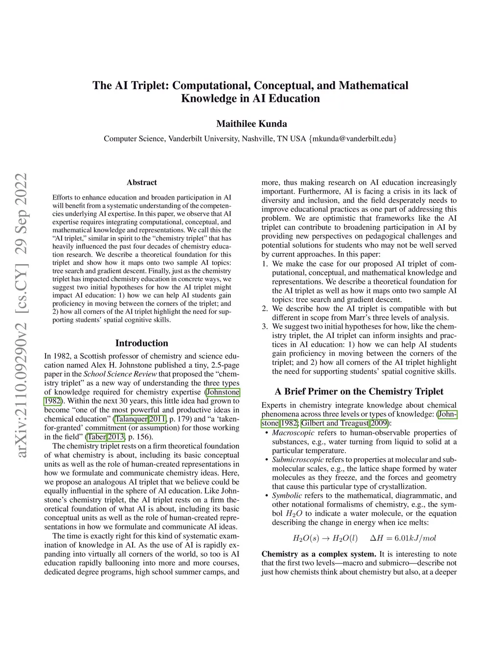Efforts to enhance education and broaden participation in AI will benefit from a systematic understanding of the competencies underlying AI expertise. In this paper, we observe that AI expertise requires integrating computational, conceptual, and mathematical knowledge and representations. We call this the ``AI triplet,'' similar in spirit to the ``chemistry triplet'' that has heavily influenced the past four decades of chemistry education research. We describe a theoretical foundation for this triplet and show how it maps onto two sample AI topics: tree search and gradient descent. Finally, just as the chemistry triplet has impacted chemistry education in concrete ways, we suggest two initial hypotheses for how the AI triplet might impact AI education: 1) how we can help AI students gain proficiency in moving between the corners of the triplet; and 2) how all corners of the AI triplet highlight the need for supporting students' spatial cognitive skills.