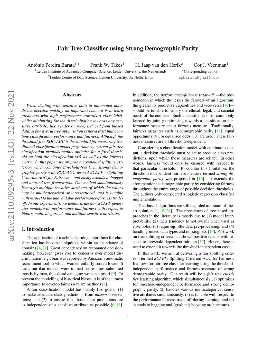 When dealing with sensitive data in automated data-driven decision-making, an important concern is to learn predictors with high performance towards a class label, whilst minimising for the discrimination towards any sensitive attribute, like gender or race, induced from biased data. A few hybrid tree optimisation criteria exist that combine classification performance and fairness. Although the threshold-free ROC-AUC is the standard for measuring traditional classification model performance, current fair tree classification methods mainly optimise for a fixed threshold on both the classification task as well as the fairness metric. In this paper, we propose a compound splitting criterion which combines threshold-free (i.e., strong) demographic parity with ROC-AUC termed SCAFF -- Splitting Criterion AUC for Fairness -- and easily extends to bagged and boosted tree frameworks. Our method simultaneously leverages multiple sensitive attributes of which the values may be multicategorical or intersectional, and is tunable with respect to the unavoidable performance-fairness trade-off. In our experiments, we demonstrate how SCAFF generates models with performance and fairness with respect to binary, multicategorical, and multiple sensitive attributes.