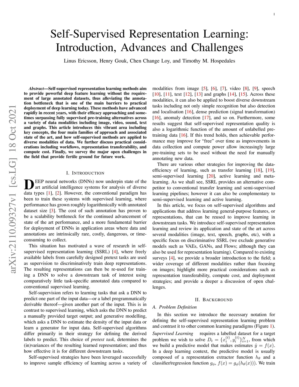 Self-supervised representation learning methods aim to provide powerful deep feature learning without the requirement of large annotated datasets, thus alleviating the annotation bottleneck that is one of the main barriers to practical deployment of deep learning today. These methods have advanced rapidly in recent years, with their efficacy approaching and sometimes surpassing fully supervised pre-training alternatives across a variety of data modalities including image, video, sound, text and graphs. This article introduces this vibrant area including key concepts, the four main families of approach and associated state of the art, and how self-supervised methods are applied to diverse modalities of data. We further discuss practical considerations including workflows, representation transferability, and compute cost. Finally, we survey the major open challenges in the field that provide fertile ground for future work.