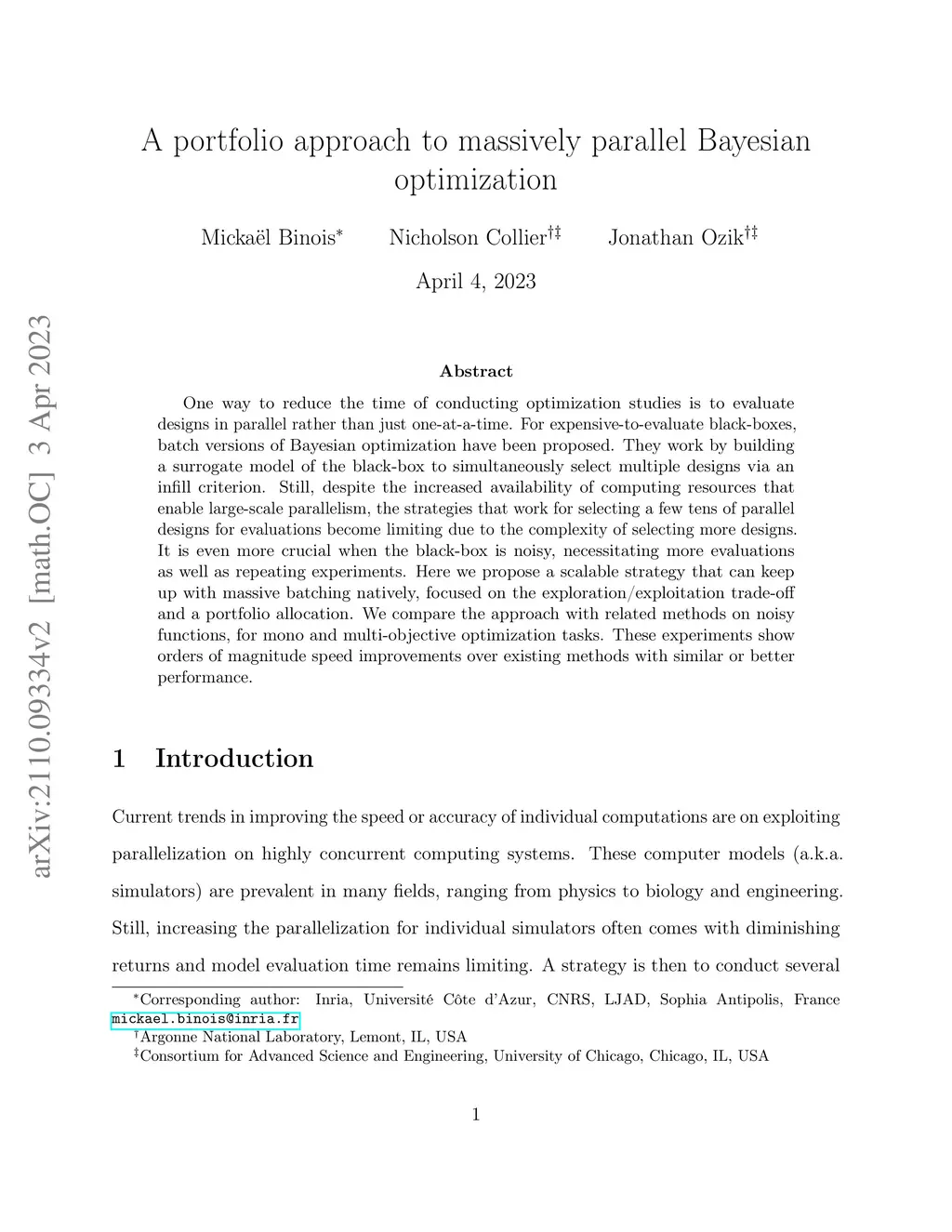 One way to reduce the time of conducting optimization studies is to evaluate designs in parallel rather than just one-at-a-time. For expensive-to-evaluate black-boxes, batch versions of Bayesian optimization have been proposed. They work by building a surrogate model of the black-box to simultaneously select multiple designs via an infill criterion. Still, despite the increased availability of computing resources that enable large-scale parallelism, the strategies that work for selecting a few tens of parallel designs for evaluations become limiting due to the complexity of selecting more designs. It is even more crucial when the black-box is noisy, necessitating more evaluations as well as repeating experiments. Here we propose a scalable strategy that can keep up with massive batching natively, focused on the exploration/exploitation trade-off and a portfolio allocation. We compare the approach with related methods on noisy functions, for mono and multi-objective optimization tasks. These experiments show orders of magnitude speed improvements over existing methods with similar or better performance.