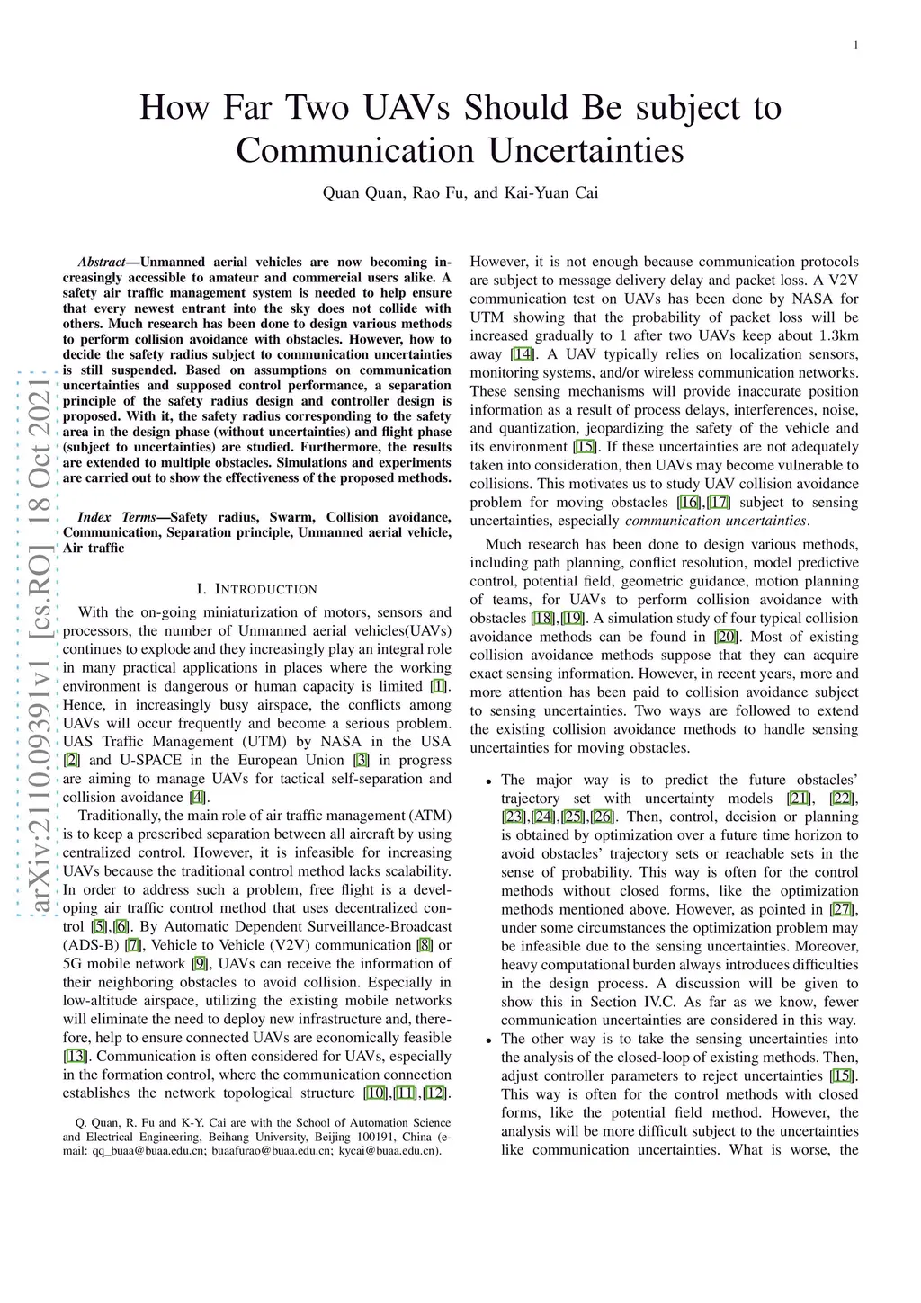 Unmanned aerial vehicles are now becoming increasingly accessible to amateur and commercial users alike. A safety air traffic management system is needed to help ensure that every newest entrant into the sky does not collide with others. Much research has been done to design various methods to perform collision avoidance with obstacles. However, how to decide the safety radius subject to communication uncertainties is still suspended. Based on assumptions on communication uncertainties and supposed control performance, a separation principle of the safety radius design and controller design is proposed. With it, the safety radius corresponding to the safety area in the design phase (without uncertainties) and flight phase (subject to uncertainties) are studied. Furthermore, the results are extended to multiple obstacles. Simulations and experiments are carried out to show the effectiveness of the proposed methods.