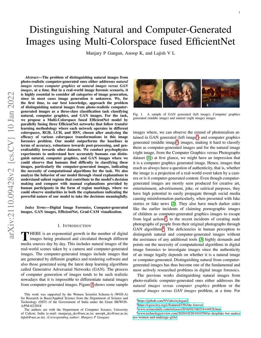 The problem of distinguishing natural images from photo-realistic computer-generated ones either addresses natural images versus computer graphics or natural images versus GAN images, at a time. But in a real-world image forensic scenario, it is highly essential to consider all categories of image generation, since in most cases image generation is unknown. We, for the first time, to our best knowledge, approach the problem of distinguishing natural images from photo-realistic computer-generated images as a three-class classification task classifying natural, computer graphics, and GAN images. For the task, we propose a Multi-Colorspace fused EfficientNet model by parallelly fusing three EfficientNet networks that follow transfer learning methodology where each network operates in different colorspaces, RGB, LCH, and HSV, chosen after analyzing the efficacy of various colorspace transformations in this image forensics problem. Our model outperforms the baselines in terms of accuracy, robustness towards post-processing, and generalizability towards other datasets. We conduct psychophysics experiments to understand how accurately humans can distinguish natural, computer graphics, and GAN images where we could observe that humans find difficulty in classifying these images, particularly the computer-generated images, indicating the necessity of computational algorithms for the task. We also analyze the behavior of our model through visual explanations to understand salient regions that contribute to the model's decision making and compare with manual explanations provided by human participants in the form of region markings, where we could observe similarities in both the explanations indicating the powerful nature of our model to take the decisions meaningfully.