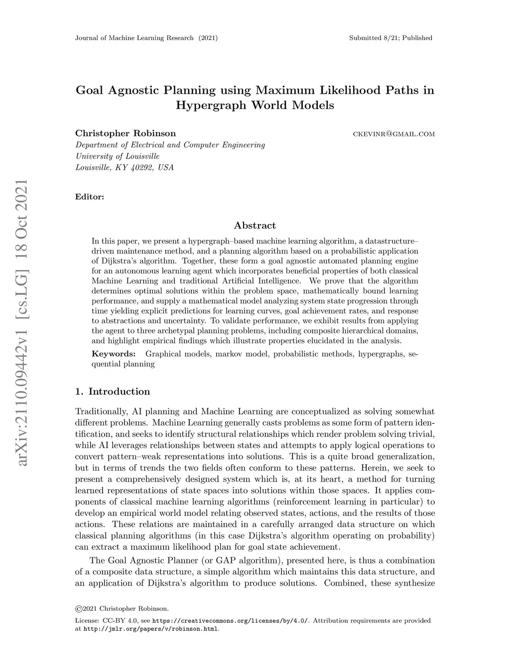 In this paper, we present a hypergraph--based machine learning algorithm, a datastructure--driven maintenance method, and a planning algorithm based on a probabilistic application of Dijkstra's algorithm. Together, these form a goal agnostic automated planning engine for an autonomous learning agent which incorporates beneficial properties of both classical Machine Learning and traditional Artificial Intelligence. We prove that the algorithm determines optimal solutions within the problem space, mathematically bound learning performance, and supply a mathematical model analyzing system state progression through time yielding explicit predictions for learning curves, goal achievement rates, and response to abstractions and uncertainty. To validate performance, we exhibit results from applying the agent to three archetypal planning problems, including composite hierarchical domains, and highlight empirical findings which illustrate properties elucidated in the analysis.