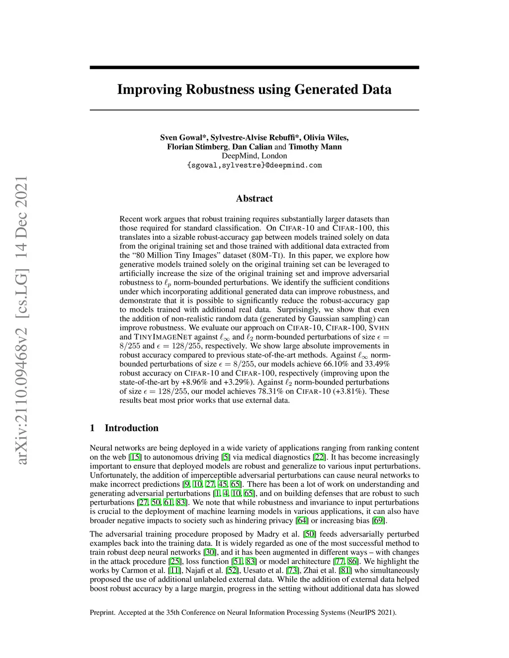 Recent work argues that robust training requires substantially larger datasets than those required for standard classification. On CIFAR-10 and CIFAR-100, this translates into a sizable robust-accuracy gap between models trained solely on data from the original training set and those trained with additional data extracted from the "80 Million Tiny Images" dataset (TI-80M). In this paper, we explore how generative models trained solely on the original training set can be leveraged to artificially increase the size of the original training set and improve adversarial robustness to p\ell_p norm-bounded perturbations. We identify the sufficient conditions under which incorporating additional generated data can improve robustness, and demonstrate that it is possible to significantly reduce the robust-accuracy gap to models trained with additional real data. Surprisingly, we even show that even the addition of non-realistic random data (generated by Gaussian sampling) can improve robustness. We evaluate our approach on CIFAR-10, CIFAR-100, SVHN and TinyImageNet against \ell_\infty and 2\ell_2 norm-bounded perturbations of size ϵ=8/255\epsilon = 8/255 and ϵ=128/255\epsilon = 128/255, respectively. We show large absolute improvements in robust accuracy compared to previous state-of-the-art methods. Against \ell_\infty norm-bounded perturbations of size ϵ=8/255\epsilon = 8/255, our models achieve 66.10% and 33.49% robust accuracy on CIFAR-10 and CIFAR-100, respectively (improving upon the state-of-the-art by +8.96% and +3.29%). Against 2\ell_2 norm-bounded perturbations of size ϵ=128/255\epsilon = 128/255, our model achieves 78.31% on CIFAR-10 (+3.81%). These results beat most prior works that use external data.