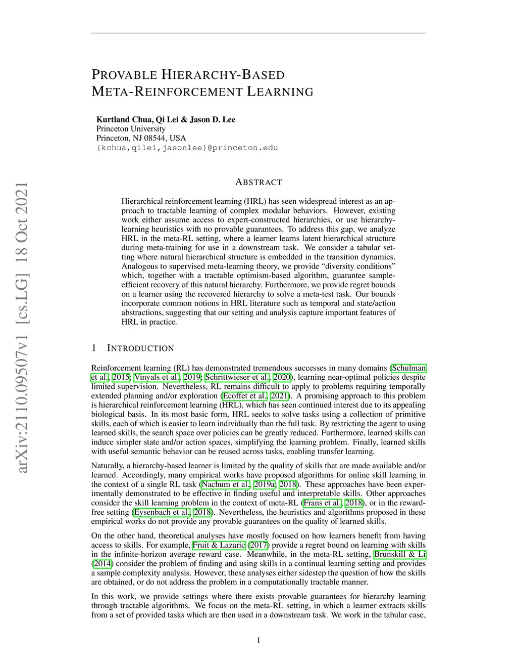 Hierarchical reinforcement learning (HRL) has seen widespread interest as an approach to tractable learning of complex modular behaviors. However, existing work either assume access to expert-constructed hierarchies, or use hierarchy-learning heuristics with no provable guarantees. To address this gap, we analyze HRL in the meta-RL setting, where a learner learns latent hierarchical structure during meta-training for use in a downstream task. We consider a tabular setting where natural hierarchical structure is embedded in the transition dynamics. Analogous to supervised meta-learning theory, we provide "diversity conditions" which, together with a tractable optimism-based algorithm, guarantee sample-efficient recovery of this natural hierarchy. Furthermore, we provide regret bounds on a learner using the recovered hierarchy to solve a meta-test task. Our bounds incorporate common notions in HRL literature such as temporal and state/action abstractions, suggesting that our setting and analysis capture important features of HRL in practice.