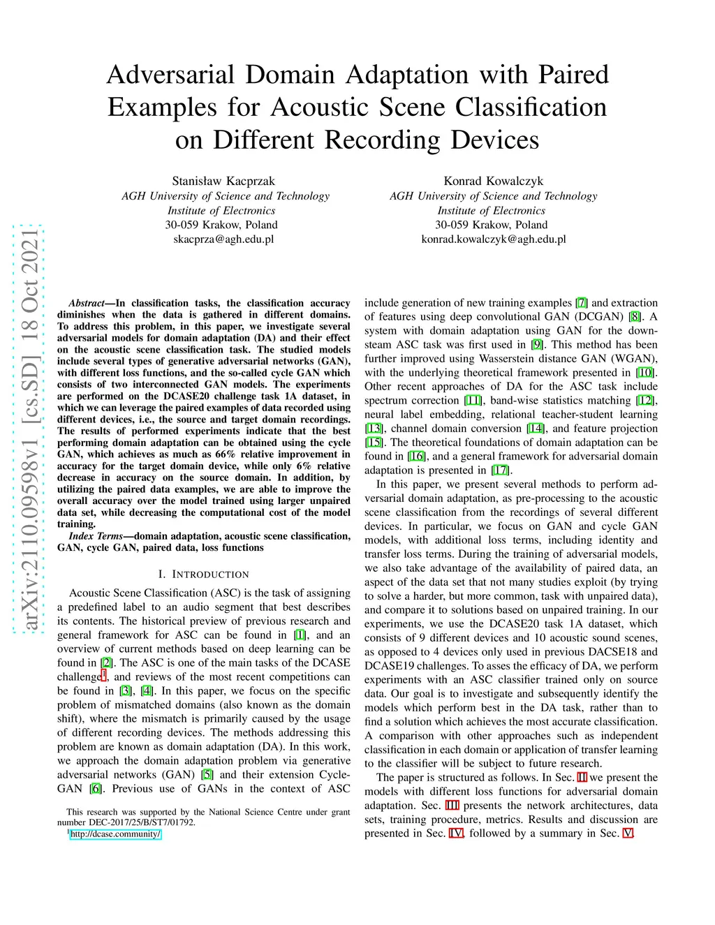 In classification tasks, the classification accuracy diminishes when the data is gathered in different domains. To address this problem, in this paper, we investigate several adversarial models for domain adaptation (DA) and their effect on the acoustic scene classification task. The studied models include several types of generative adversarial networks (GAN), with different loss functions, and the so-called cycle GAN which consists of two interconnected GAN models. The experiments are performed on the DCASE20 challenge task 1A dataset, in which we can leverage the paired examples of data recorded using different devices, i.e., the source and target domain recordings. The results of performed experiments indicate that the best performing domain adaptation can be obtained using the cycle GAN, which achieves as much as 66% relative improvement in accuracy for the target domain device, while only 6\% relative decrease in accuracy on the source domain. In addition, by utilizing the paired data examples, we are able to improve the overall accuracy over the model trained using larger unpaired data set, while decreasing the computational cost of the model training.
