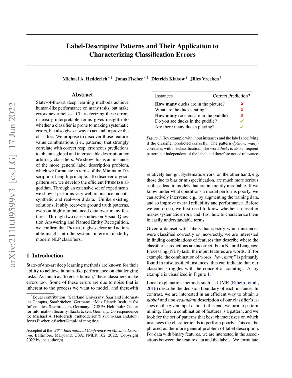 State-of-the-art deep learning methods achieve human-like performance on many tasks, but make errors nevertheless. Characterizing these errors in easily interpretable terms gives insight into whether a classifier is prone to making systematic errors, but also gives a way to act and improve the classifier. We propose to discover those feature-value combinations (i.e., patterns) that strongly correlate with correct resp. erroneous predictions to obtain a global and interpretable description for arbitrary classifiers. We show this is an instance of the more general label description problem, which we formulate in terms of the Minimum Description Length principle. To discover a good pattern set, we develop the efficient Premise algorithm. Through an extensive set of experiments we show it performs very well in practice on both synthetic and real-world data. Unlike existing solutions, it ably recovers ground truth patterns, even on highly imbalanced data over many features. Through two case studies on Visual Question Answering and Named Entity Recognition, we confirm that Premise gives clear and actionable insight into the systematic errors made by modern NLP classifiers.